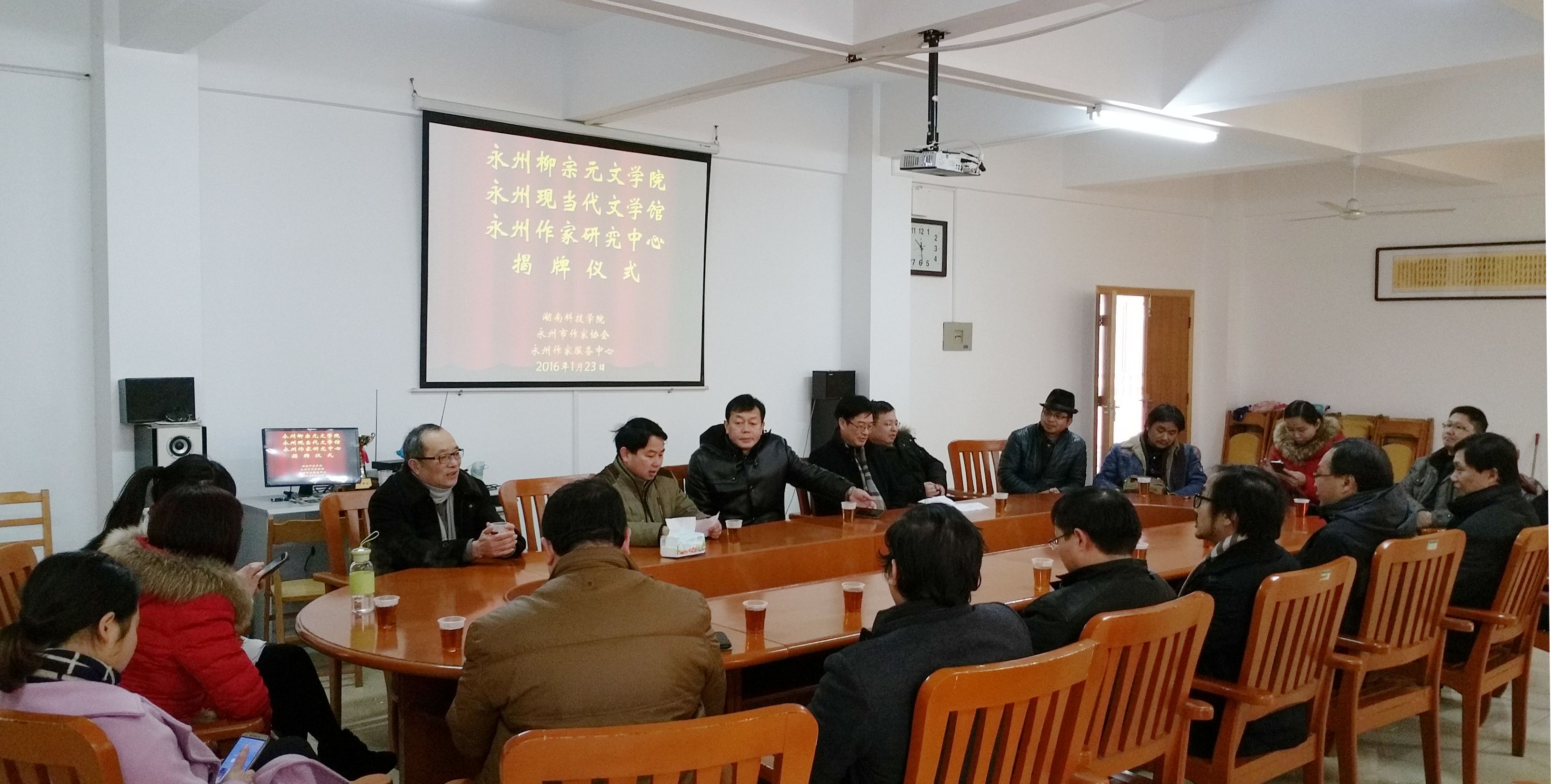 雪后初霁,喜气洋洋。1月23日上午,由金沙集团1862cc、永州市作家协会、永州作家服务中心联合举办的永州柳宗元文学院、永州现当代文学馆、永州作家研究中心揭牌仪式在金沙集团举行。副校长宋宏福、李常健,副校级督导、工会主席陈仲庚,永州市委宣传部副部长蒋三立,永州市作协主席郑正辉出席仪式并揭牌。学校图书馆、科技处(服务地方办公室)、人文与社会科学学院负责人及《永州日报》、永州新闻网、《品读永州》代表等二十余人参加会议。