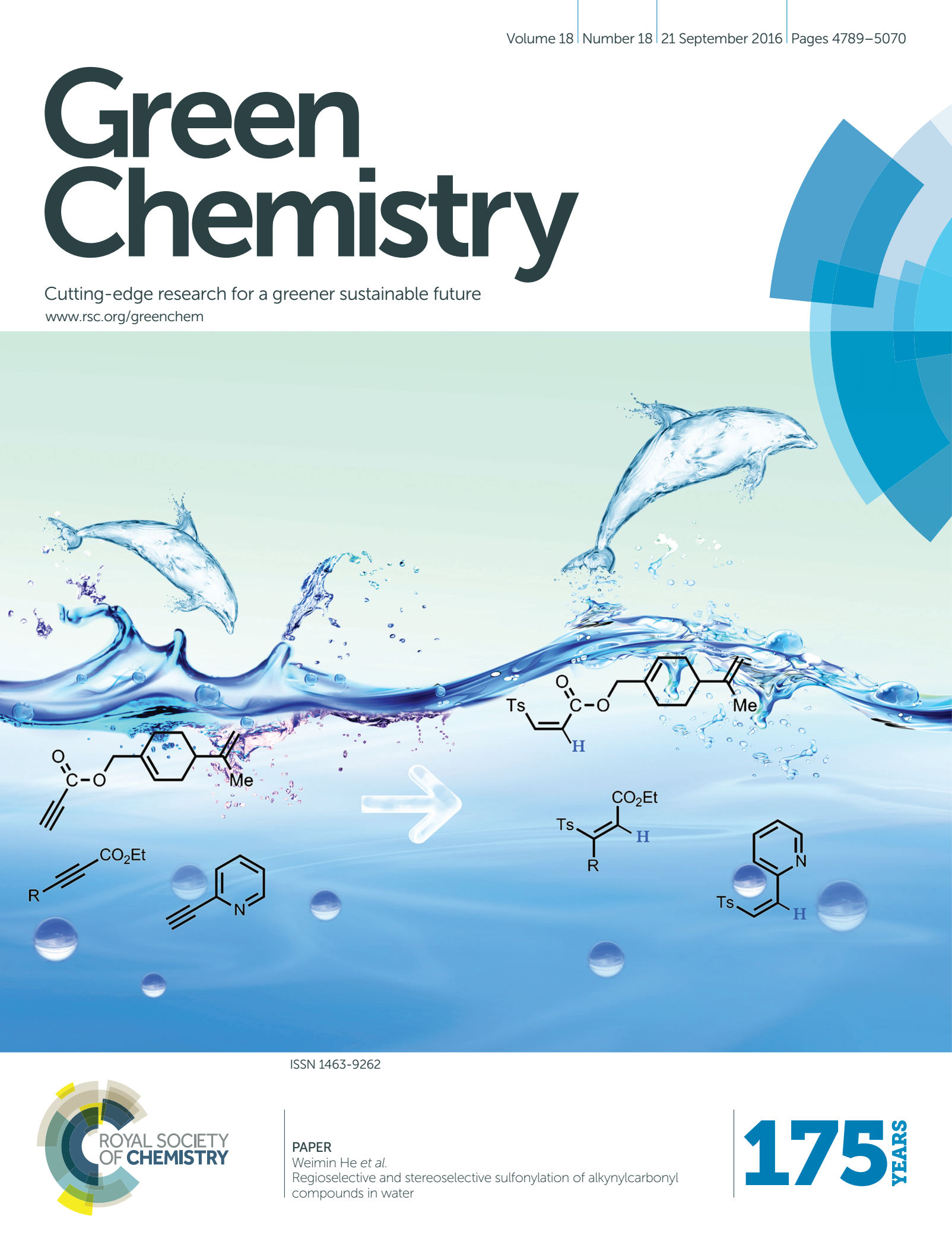 《Green Chemistry》是绿色化学领域学术期刊中影响因子最高的杂志,影响因子8.506。SCI期刊封面论文是期刊编辑部严格依据学术价值的标准遴选出来的,被推选的论文必须具有重要突破意义。封面论文体现了期刊编辑部对论文作者和所在研究院校学术研究能力的充分肯定。李文艺博士的该项研究首次实现重要生物活性物质β-磺酰基烯酸酯的绿色选择性合成,具有较大的创新性与重要的科研、应用价值,因此,被推荐为该期刊封面论文。