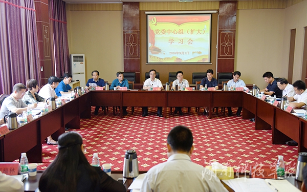 本网讯 (摄影 何帅文)9月1日,党委中心组(扩大)在行政办公楼八楼三会议室专题学习了习近平总书记在庆祝中国共产党成立95周年纪念大会上的讲话、省委组织部副部长胡奇在2016年全省普通高校领导干部暑期研讨班上的讲话、《中国共产党问责条例》、《湖南省普通高等学校党委领导下的校长负责制实施办法》和《金沙集团1862cc章程》等讲话和文件精神。校党委书记陈弘主持并讲话。