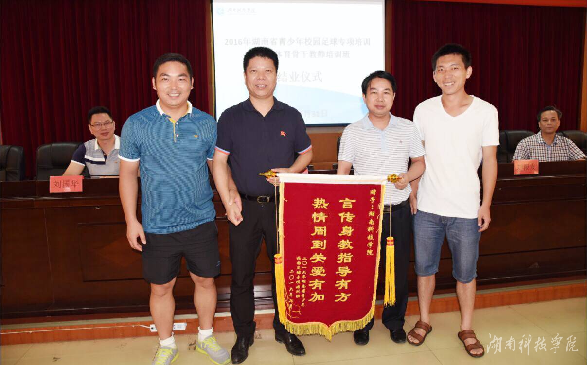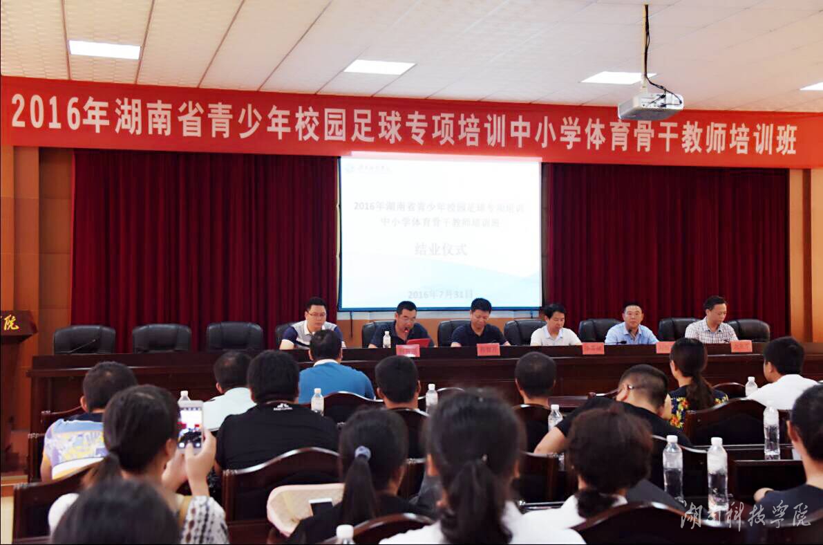 本网讯(通讯员 刘国华) 7月31日上午,为期14天的2016年湖南省青少年校园足球专项培训中小学体育骨干教师培训班圆满结束。副校长李常健、程智开出席结业仪式,并为优秀学员颁发荣誉证书。