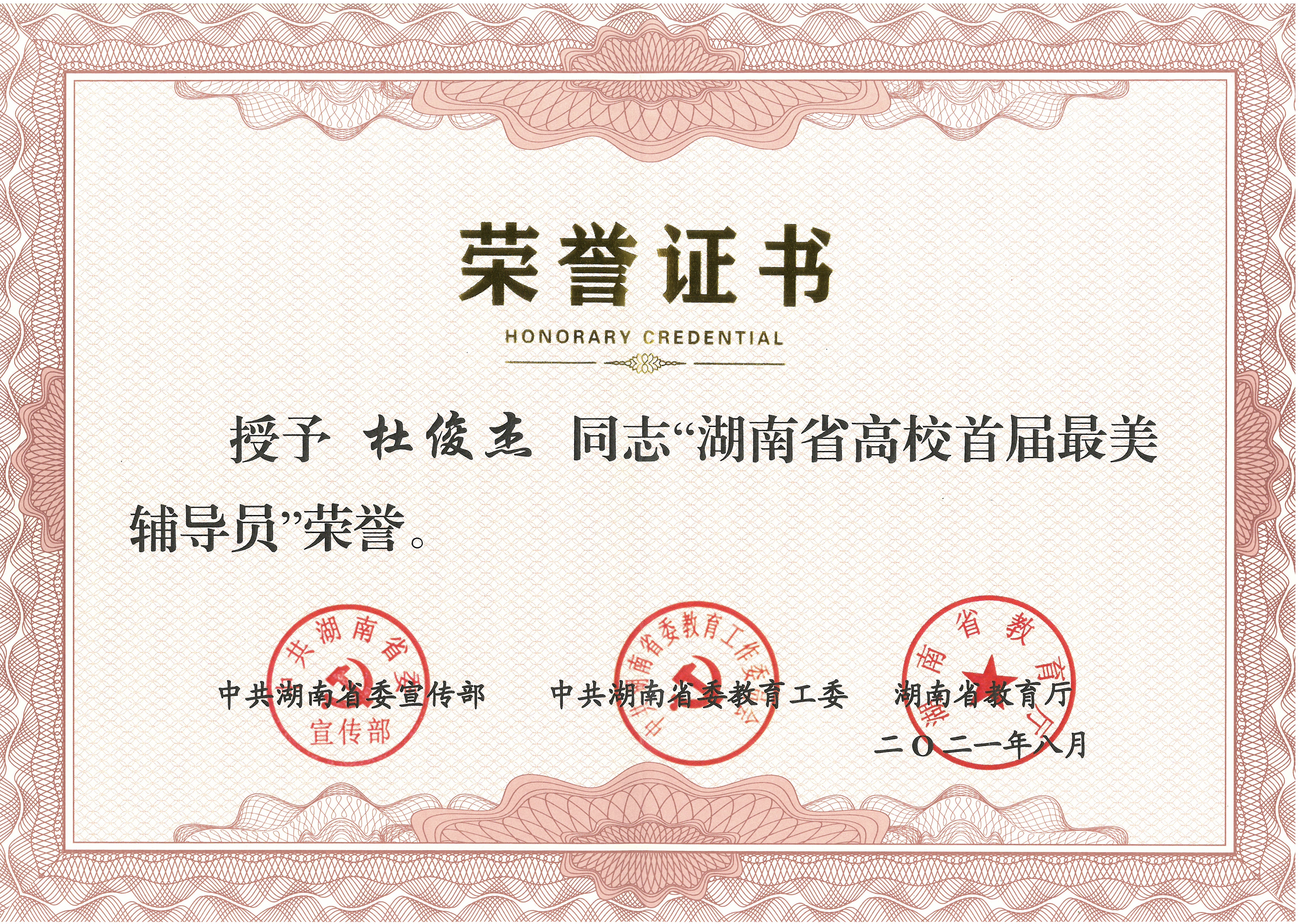 本网讯 近日,在由省委宣传部、省委教育工委、省教育厅举办的全省高校首届最美思政课教师、最美辅导员、最美大学生推选展示活动中,金沙集团理学院辅导员杜俊杰获评“最美辅导员”。