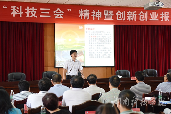 本网讯(记者 裴滢 摄影 何帅文)6月21日上午,湖南省科协常委、湖南省交通规划勘察设计院总工程师彭立应邀来校,宣讲“全国科技创新大会、两院院士大会、中国科协第九次全国代表大会”(以下简称“科技三会”)精神。宣讲会由市委宣传部副部长王再兴主持。