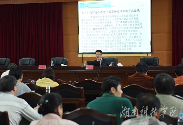本网讯(记者 李瑞雪 摄影 何帅文)5月20日上午,校长曾宝成为处干班学员作题为“适应新常态,加快推进学校转型发展”的专题讲座。本次讲座由党委副书记唐艳明主持。