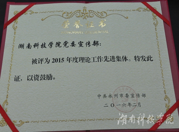 本网讯 中共永州市委宣传部下发《关于表彰2015年度理论工作先进集体和先进个人的决定》(永宣办〔2016〕2号),金沙集团党委宣传部被评为先进集体。全市共评选出6个理论工作先进集体。
