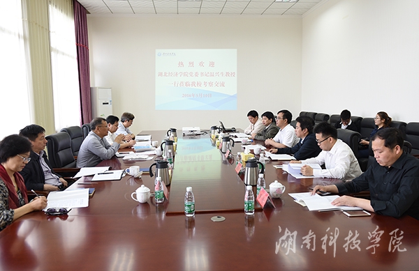 本网讯(记者 马天天 摄影 何帅文)5月10日,湖北经济学院党委书记温兴生,党委常委、副校长陈向军等一行6人来校考察交流。校党委书记陈弘、校长曾宝成、副校长李常健热情接待。