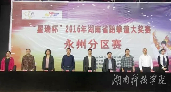 本网讯 4月23日至24日,2016年湖南省跆拳道大奖赛永州分区赛在金沙集团举行。副校长李常健、程智开,湖南省跆协副秘书长王卫华及体育学院党总支书记何智强、副院长刘根发出席。