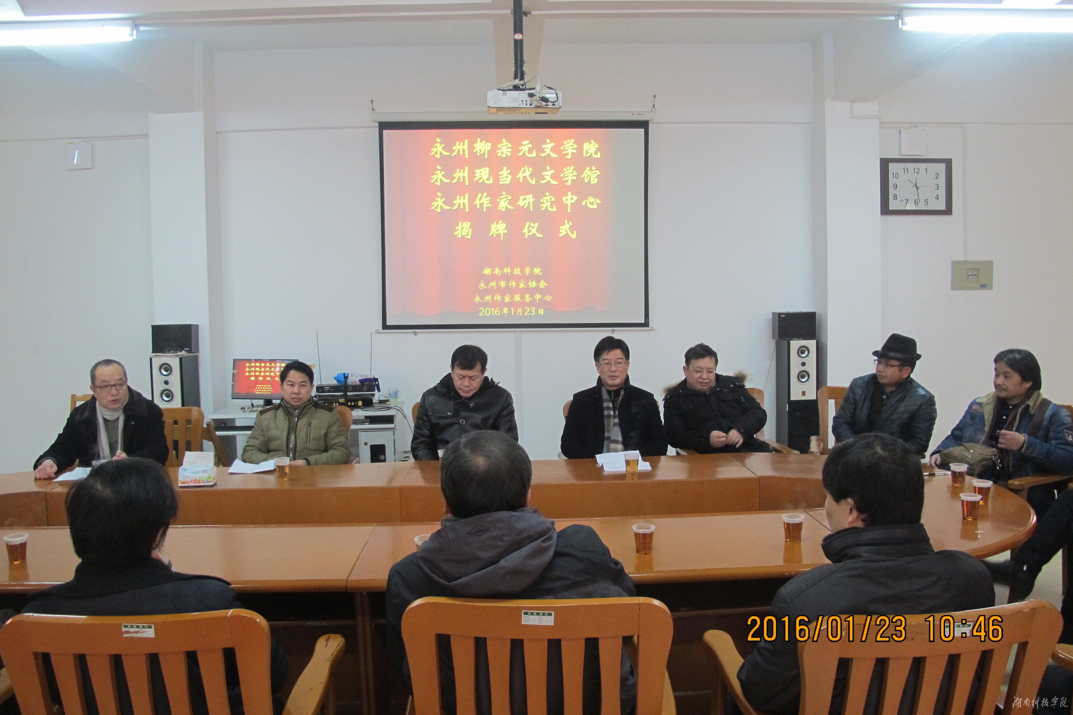 本网讯(通讯员 潘清远)雪后初霁,喜气洋洋。1月23日上午,由永州市作家协会、永州作家服务中心和金沙集团联合举办的永州柳宗元文学院、永州现当代文学馆、永州作家研究中心举行揭牌仪式。副校长宋宏福、李常健,副校级督导、工会主席陈仲庚,永州市委宣传部副部长蒋三立,永州市作协主席郑正辉出席仪式并揭牌。学校图书馆、科技处(服务地方办公室)、人文与社会科学学院负责人及《永州日报》、永州新闻网、《品读永州》代表等20余人参加会议。