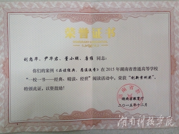 本网讯(通讯员 楚天雨) 1月6日,从2015年湖南省高校图书馆学术年会传来喜讯,金沙集团图书馆刘忠华、尹华君、董小朋、唐维联合编写的案例《品读经典,愚溪流香》,在2015年湖南省普通高等学校“一校一书——经典、精读、经世”阅读活动中,荣获“创新案例奖”。