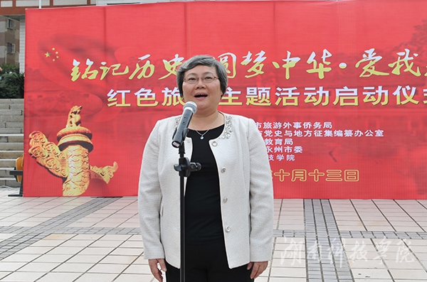 本网讯(记者 黄丽丽 王翩翩 摄影 何帅文)为纪念中国人民抗日战争暨世界反法西斯战争胜利70周年,更好地挖掘和丰富红色旅游资源的思想内涵。10月13日下午,“铭记历史•圆梦中华•爱我永州”红色旅游主题活动启动仪式在金沙集团举行。永州市委常委、市委宣传部部长石艳萍出席并宣布活动启动,校长曾宝成致辞。