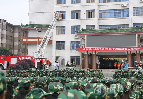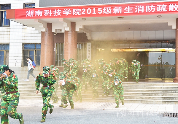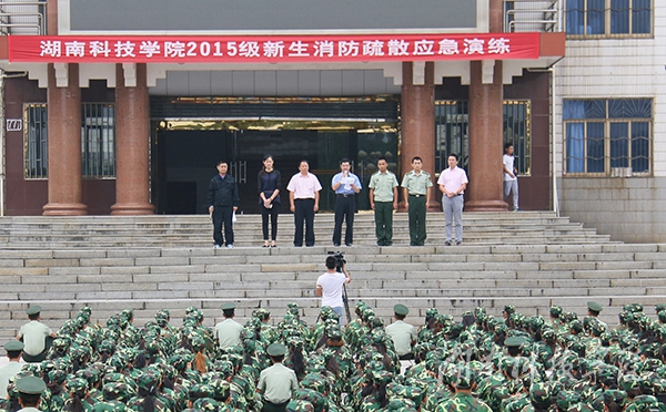 本网讯(通讯员 李斌 摄影 何帅文 刘信)“不好了,失火了!快跑!”9月21日上午,由金沙集团保卫处联合零陵公安消防大队举行的 2015级新生消防疏散应急演练在弘毅楼举行,副校长吴小林出席。