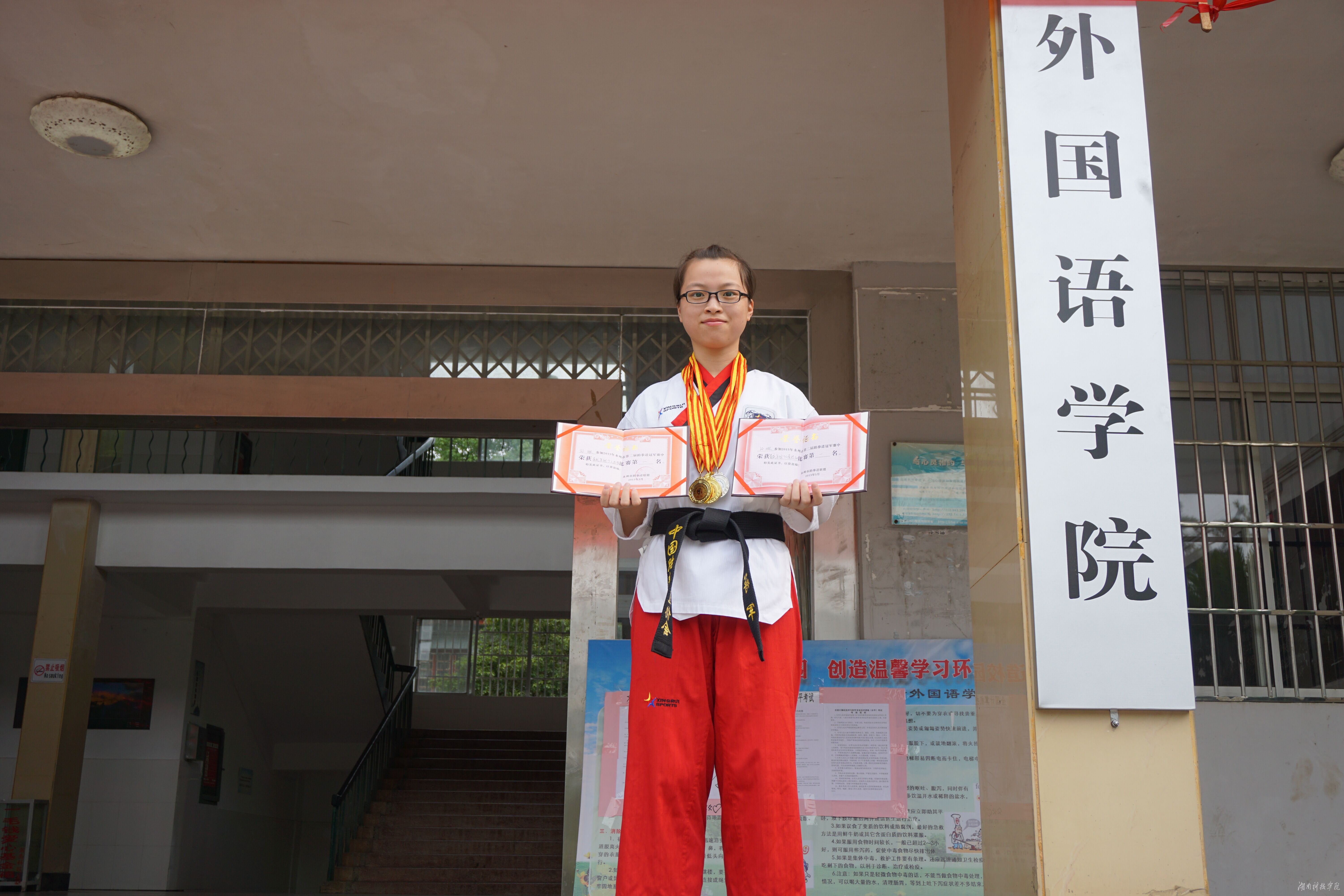 本网讯(通讯员 陈小峰)6月2日,从永州市跆拳道冠军赛传来喜讯,金沙集团外国语学院2014级学生孙琳荣获青成年组混双品势、个人品势、个人竞技三项冠军,青成年组团体品势银牌。