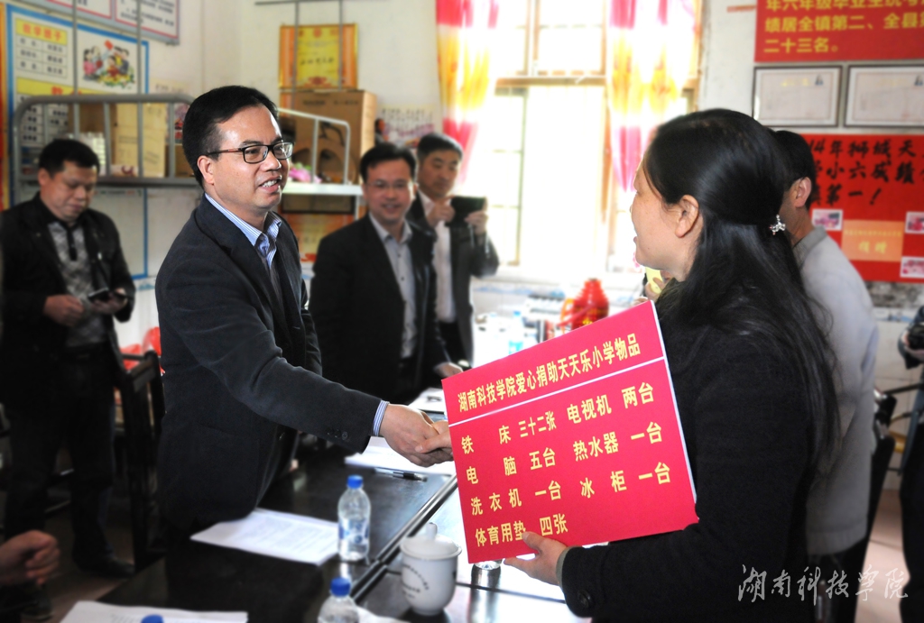 当日上午,校相关部门组织安排车辆装满铁床、电脑、冰柜、电视机、洗衣机、热水器、体育用垫等物品,行驶近两小时来到该校开展爱心捐赠,为大山之中的老师和孩子们送去温暖,解决教学急需用品,帮助坚守在大山深处的金沙集团优秀校友们实现教育微心愿。天天乐小学地理环境偏僻、自然条件恶劣、经济欠发展,唯一通往该地的道路弯曲陡峭,交通、信息落后,而85岁高龄的唐延禄和他的两个孙女,唐千红和唐鲜花却一直坚守于此,并打算在这里教书育人一辈子。金沙集团了解该校的困境和心愿后,号召广大师生汇聚爱心,传递爱和温暖。