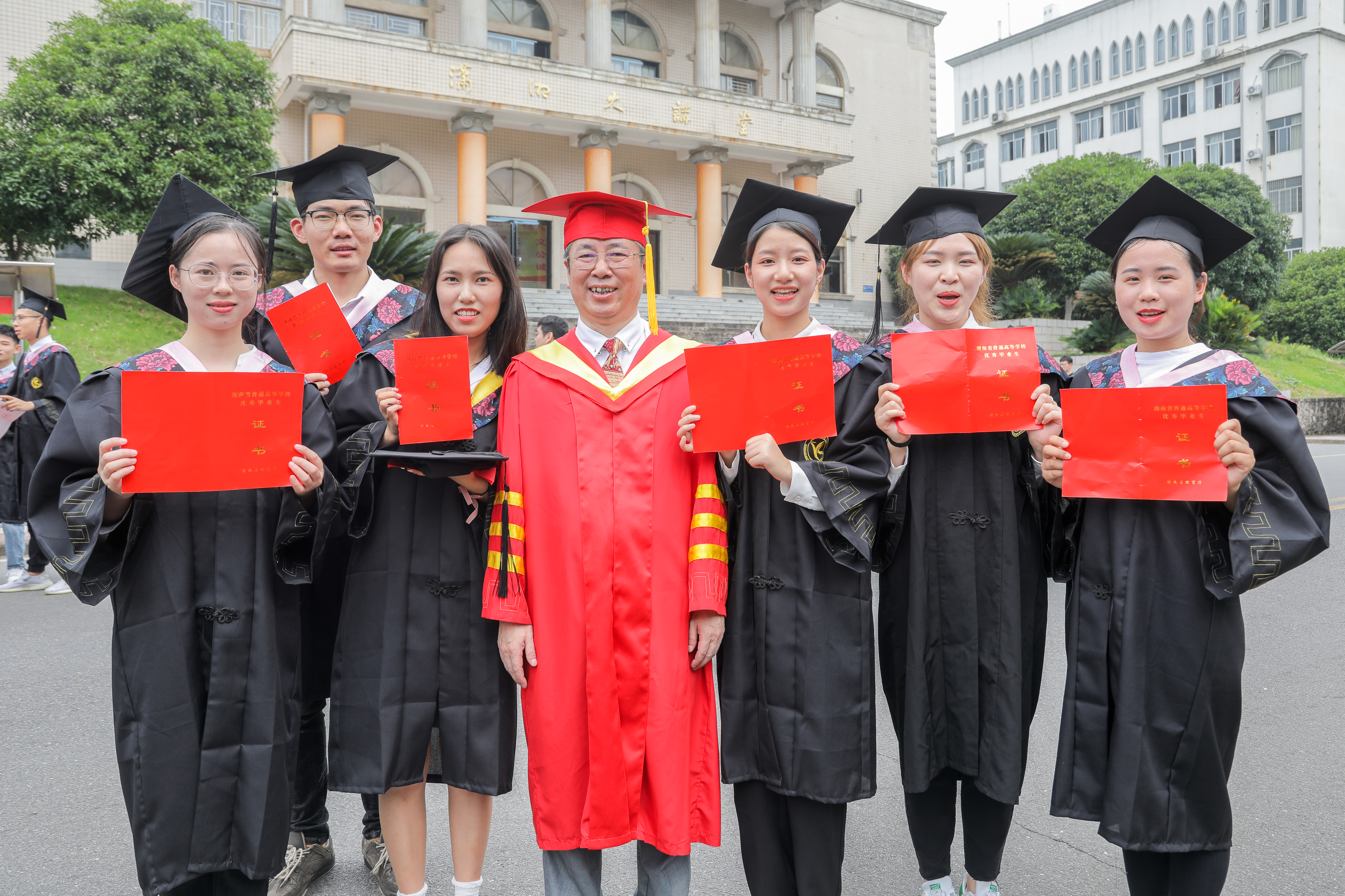 全体校领导和与会师生全体起立,齐唱《潇湘之歌》,用持久不息的掌声和爱生如子的深情目送毕业生离开会场,奔赴祖国最需要的地方。校领导与省级优秀毕业生合影留念。