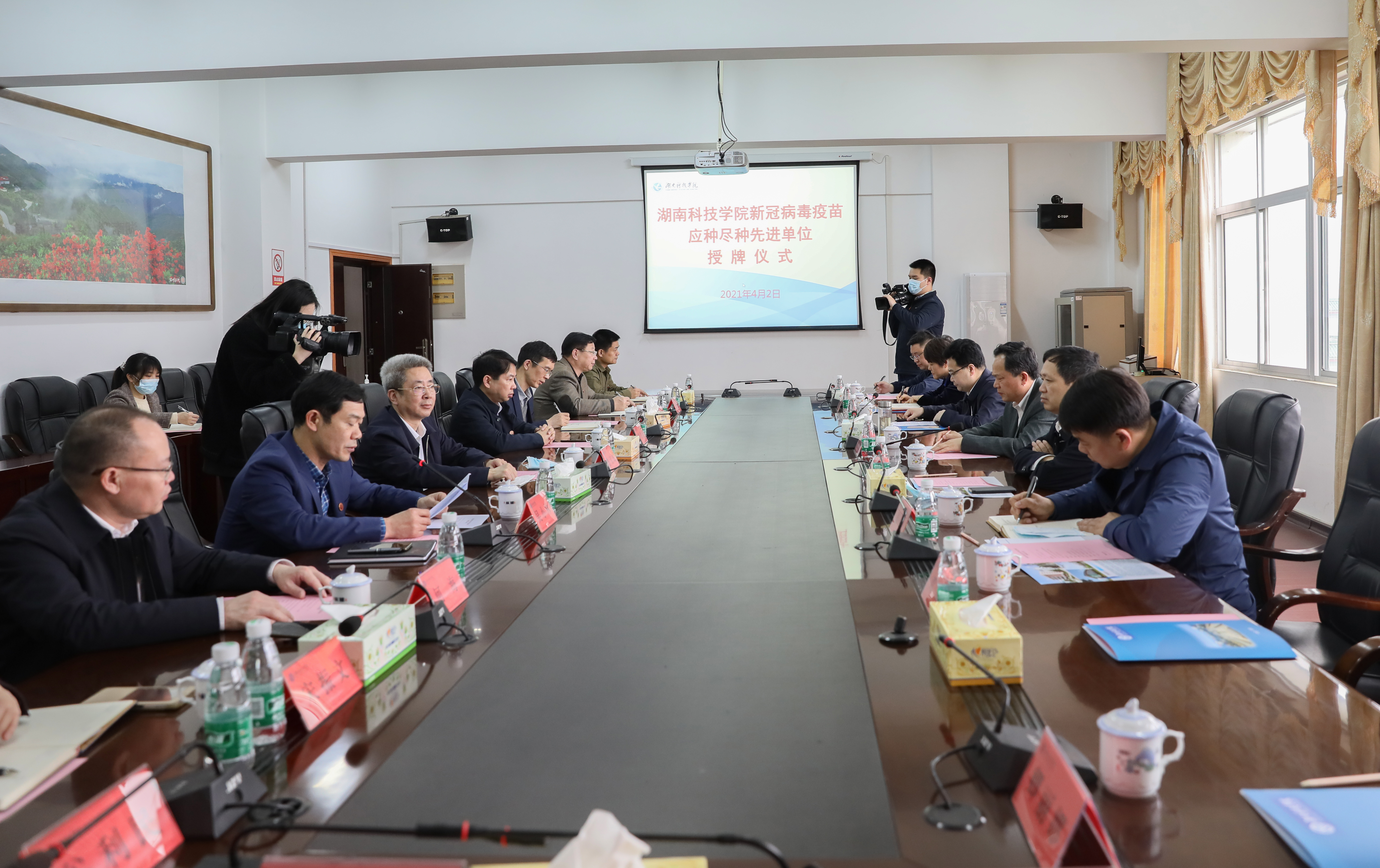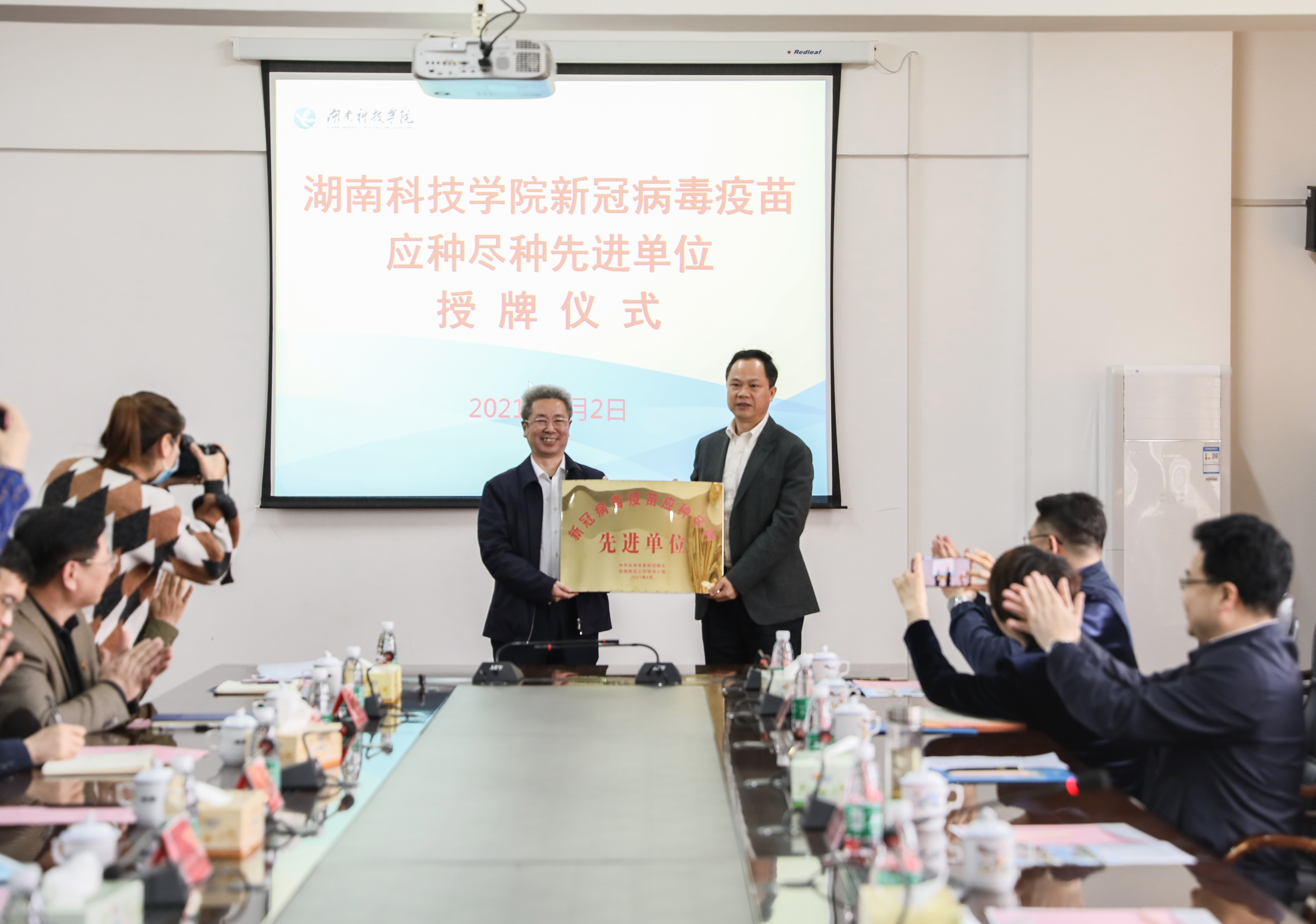 本网讯 4月2日,学校荣获永州市首个“新冠病毒疫苗应种尽种先进单位”称号,市人民政府副市长谢景林为学校授牌,校党委书记曾宝成,市卫健委党组书记刘建能,校领导李常健、吴小林、陈灿军、何海出席活动。