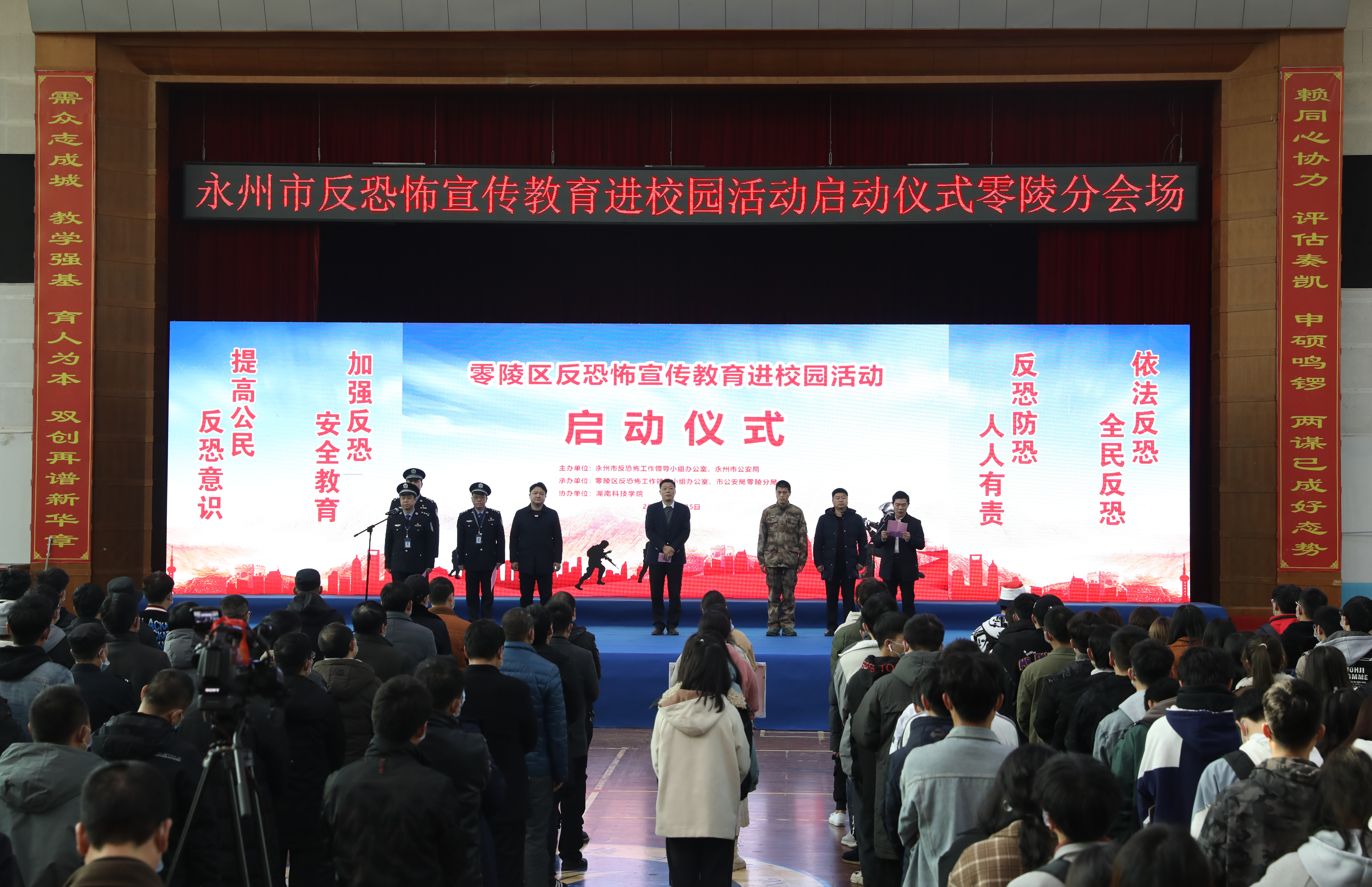 本网讯 12月25日下午,零陵区“反恐怖宣传教育进校园”活动在金沙集团启动。校党委委员、副校长吴小林,零陵区委常委、政法委书记唐会国,零陵区人民政府副区长、公安分局局长王小会出席活动,启动仪式由王小会主持。