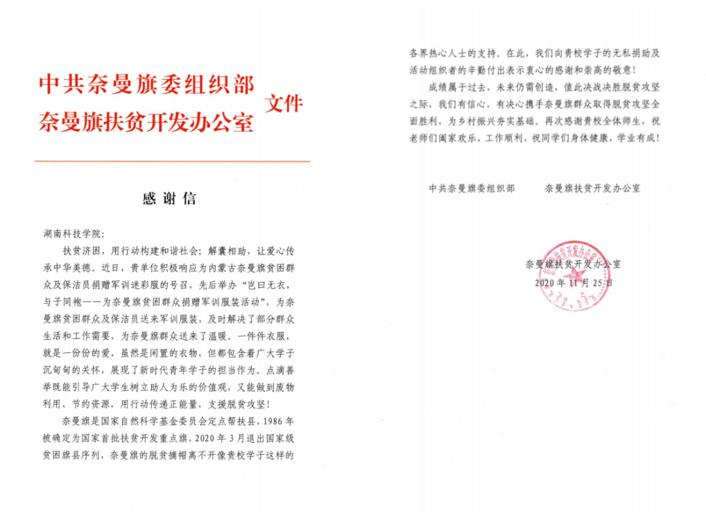 “一件件衣服,就是一份份的爱,包含了广大学子沉甸甸的的关怀,展现了新时代青年学子的担当作为。”10月底,学校接到了奈曼旗发来的捐助号召。由校团委发起,理学院青年志愿服务团联合各教学学院青年志愿团组织开展“衣旧深情 爱心传递”2020级新生军训服捐赠活动,为奈曼旗父老乡亲共计捐赠900多套军训服。