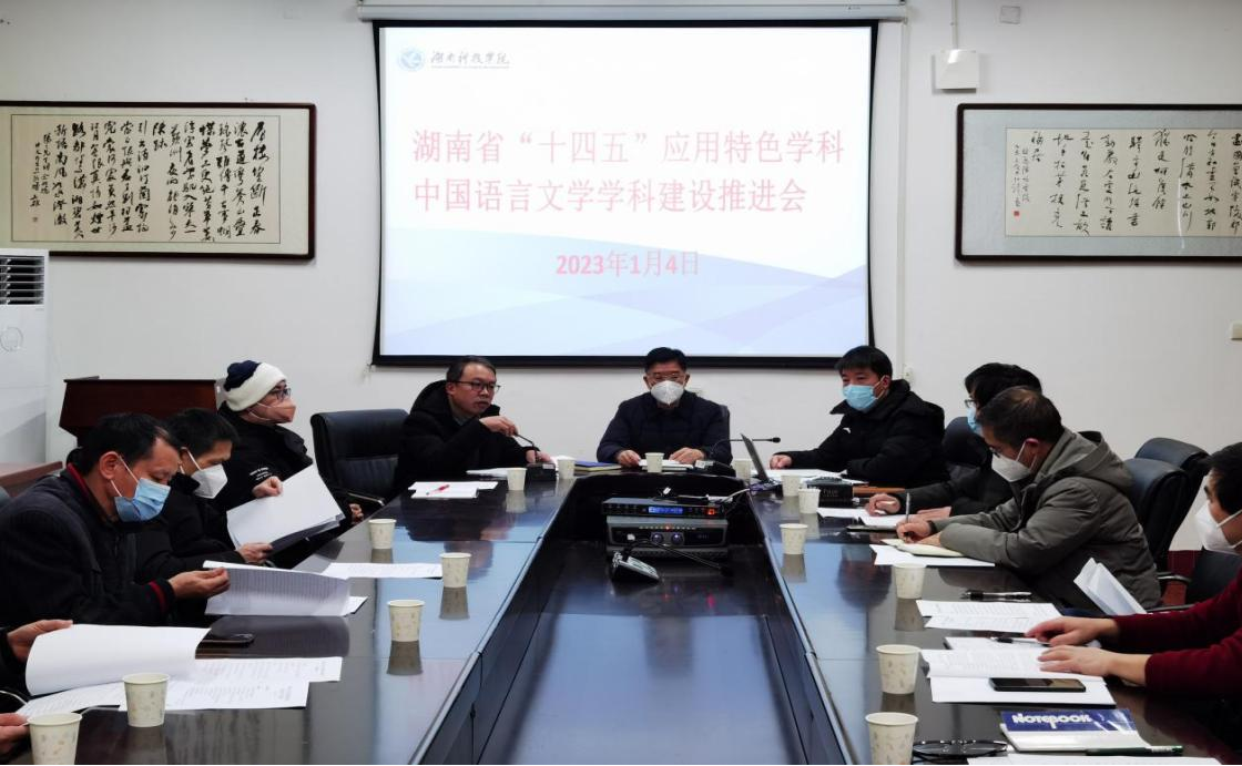本网讯 1月4日上午,湖南省“十四五”应用特色学科中国语言文学学科建设推进会在明德楼203会议室召开。党委副书记宋宏福、学科负责人、方向带头人以及学科骨干成员参加了会议。会议围绕“开好局、起好步,推动‘十四五’学科高质量发展”这一主题进行了深入交流与探讨。文法学院党总支书记谷显明主持会议。