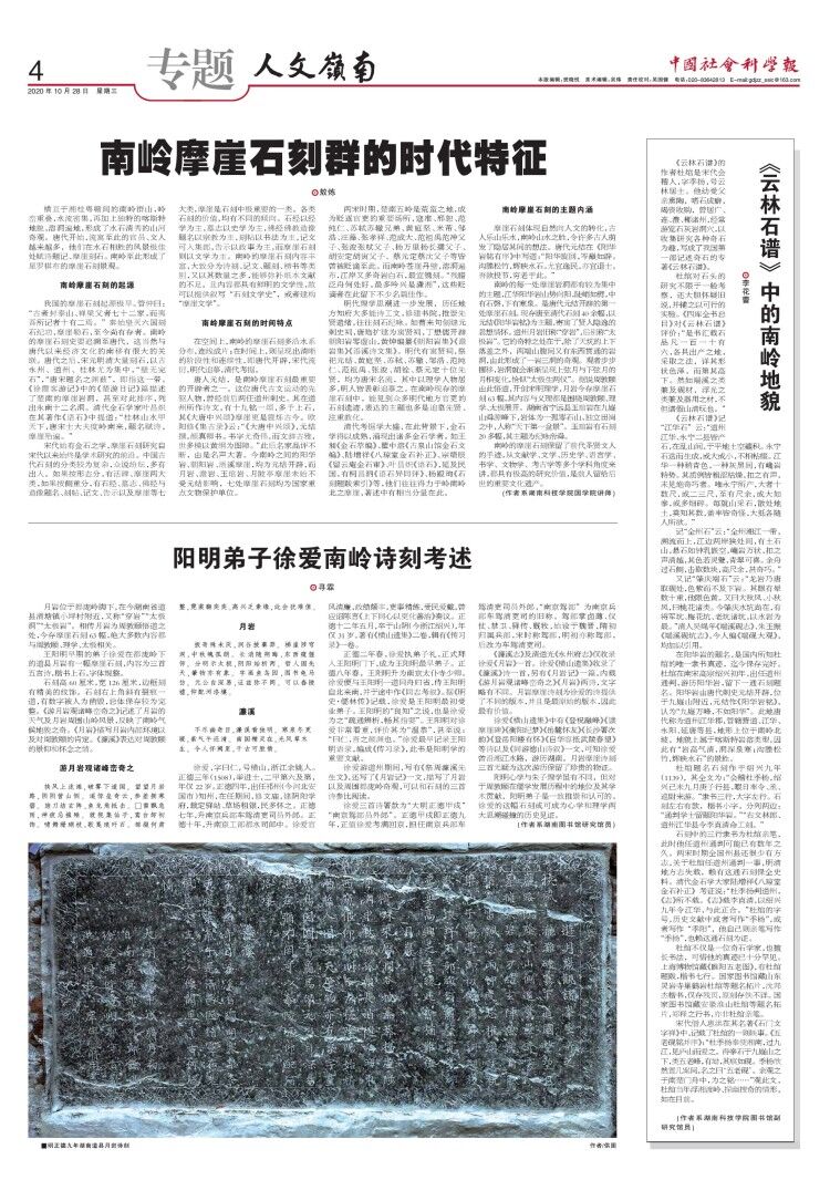 本网讯 《中国社会科学报》“人文岭南”专版10月28日整版刊登了金沙集团国学院摩崖石刻研究团队的三篇文章,包括“摩崖碑拓”课程专任讲师敖炼的《南岭摩崖石刻群的时代特征》,图书馆副研究馆员李花蕾的《〈云林石谱〉中的南岭地貌》,国学院特聘教授、湖南图书馆研究馆员寻霖的《阳明弟子徐爱南岭诗刻考述》。