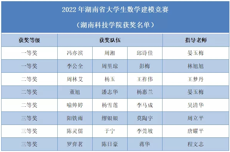 本网讯 近日,由湖南省教育厅主办的2022年湖南省大学生数学建模竞赛暨全国大学生数学建模竞赛湖南赛区比赛获奖揭晓。金沙集团代表队荣获一等奖2项,二等奖3项,三等奖3项,理学院林旭旭老师、晏玉梅老师被授予2022年湖南省大学生数学建模竞赛优秀指导教师。这是金沙集团近年在该项赛事中的最佳成绩。