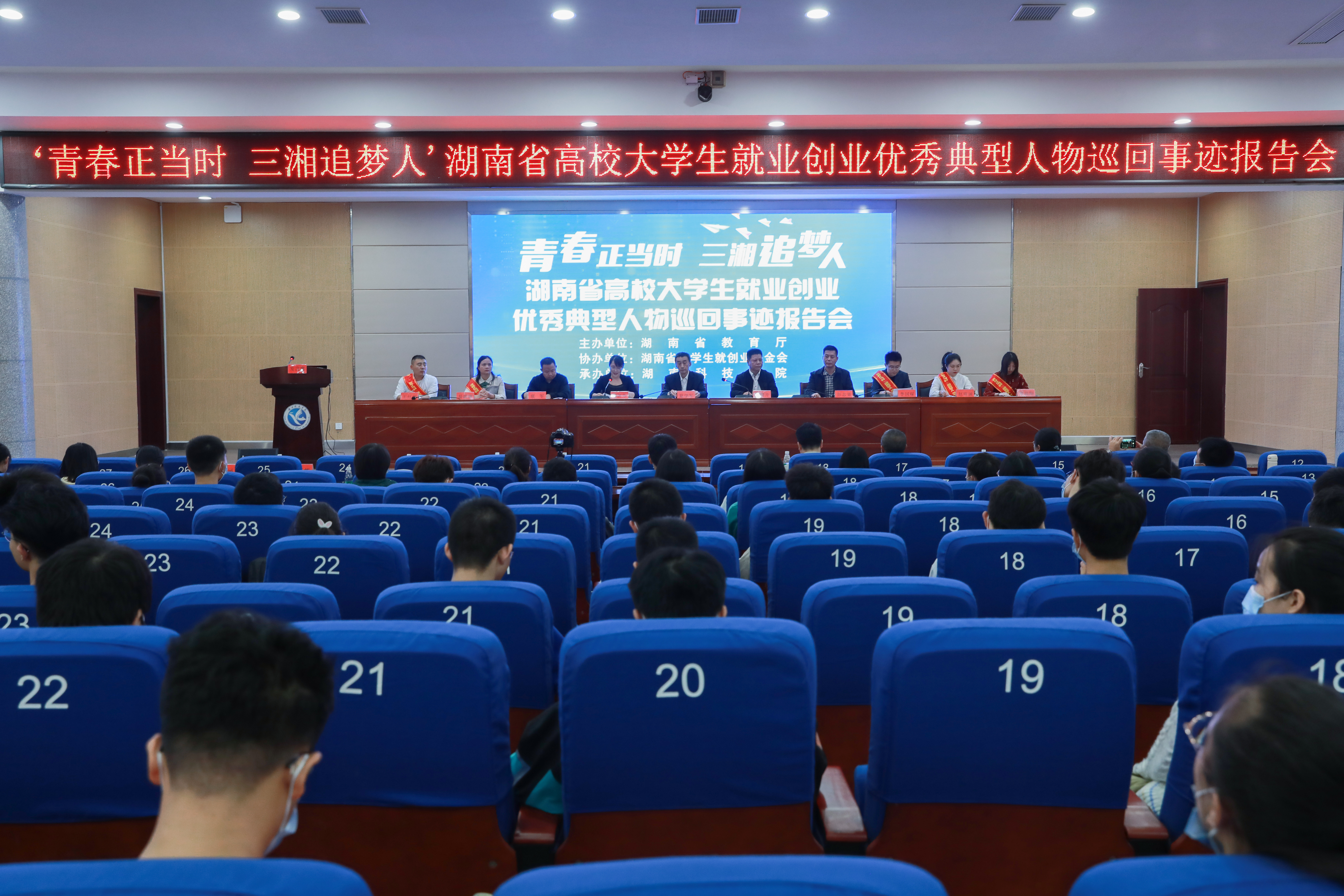 报告会上,金沙集团毕业生、山东旭兴网络科技有限公司董事长李国琛,中南大学毕业生、湖南易能生物医药有限公司创始人易跃能,长沙学院毕业生、福建省光泽县止马镇团委副书记赵瑱涵,湘潭医卫职业技术学院毕业生、湘潭第六人民医院护士、援鄂抗疫先锋队队员罗晨阳,湖南医药学院毕业生、长沙果缤纷商业管理有限公司联合创始人王红伟等5位就业创业优秀典型,分享了各自学习、科研、扎根基层、就业创业的先进事迹。