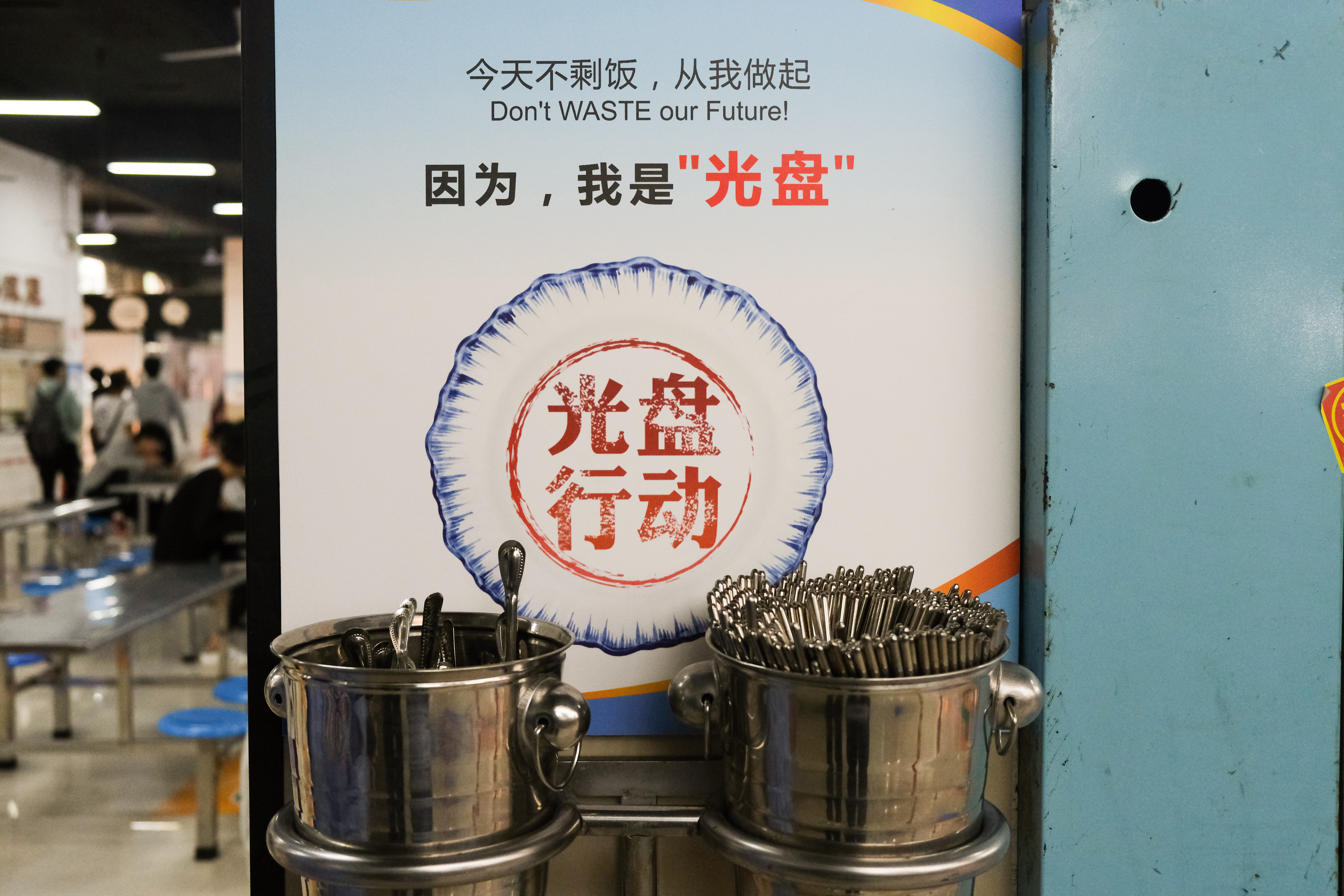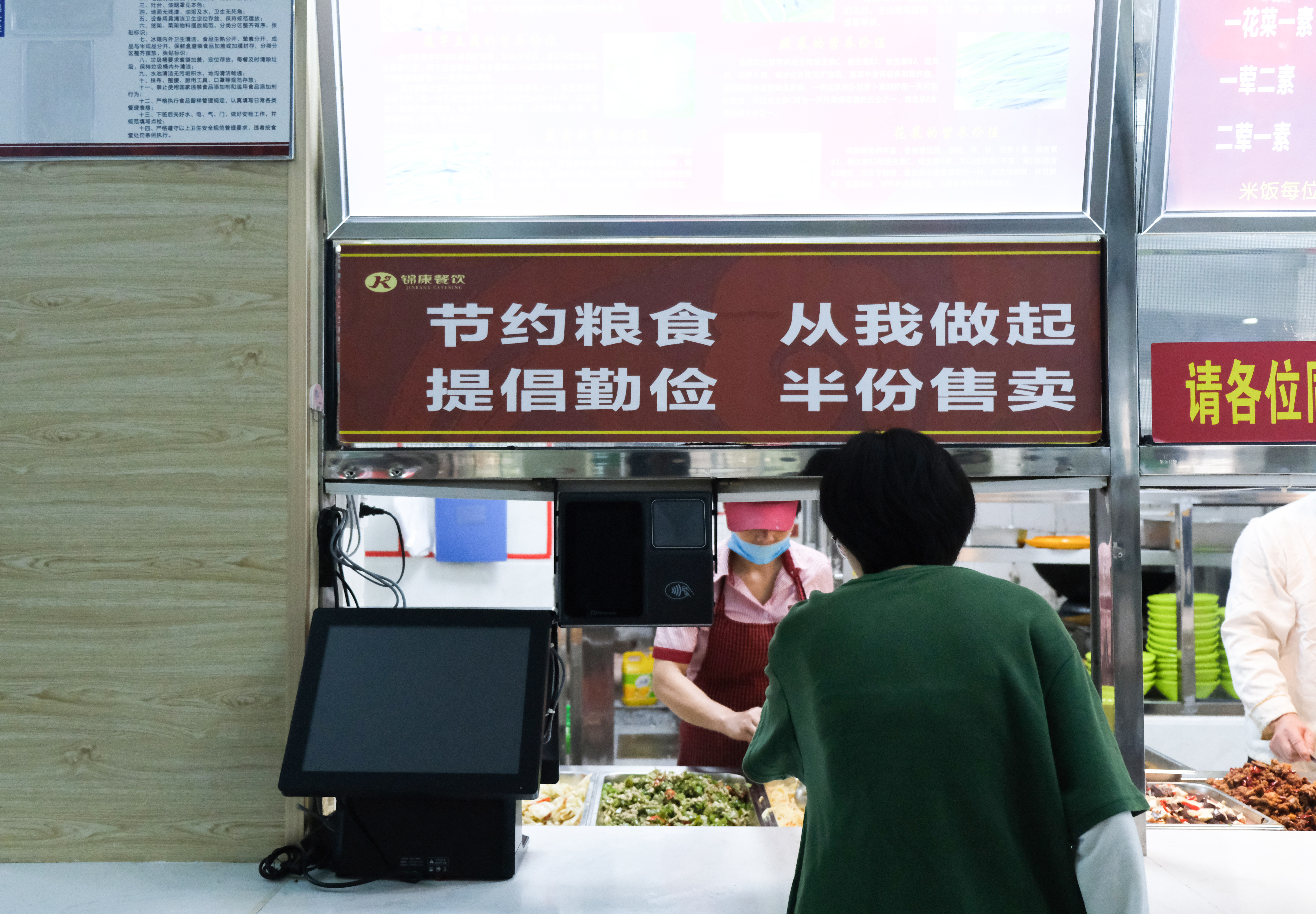 在校园的各个食堂里,“粒粒不易,不倒不弃”“光盘行动,从我做起”“杜绝浪费,爱惜粮食”等主题宣传满眼皆是。就餐过程中,还有由学生组成的民委会和监督检查员在食堂里引导同学们按需取餐、适量消费,劝阻餐饮浪费行为。