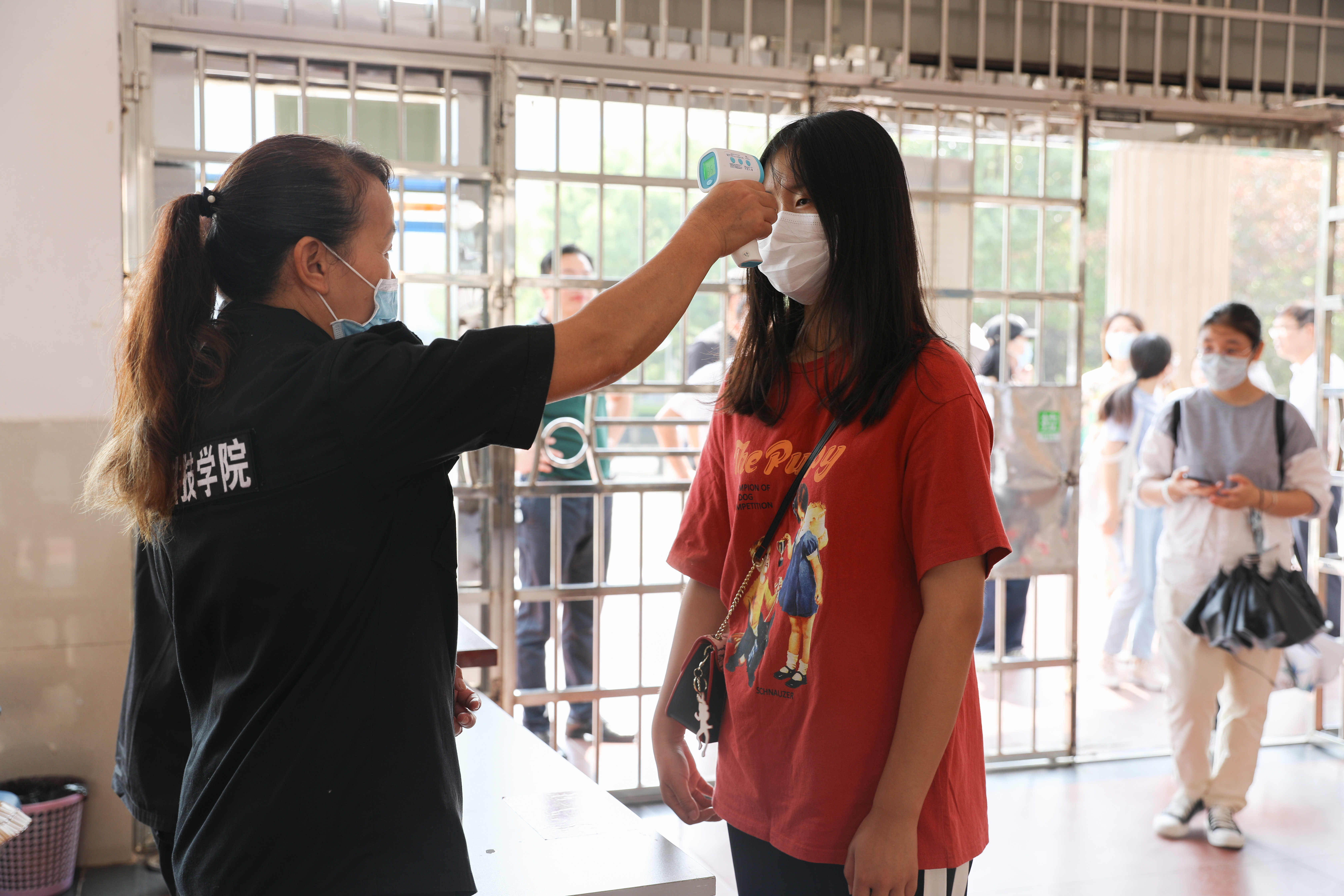 演练中,返校学生佩戴口罩按指示标识排队等候进校,每人间隔1.5米。经值班辅导员引导到“入校通道”,接受健康码核验,显示为绿色且无中高风险地区旅居史的学生,即可至东大门体温监测区进行体温检测,体温正常者可有序进校。如中高风险地区旅居史的学生,还需出示开学前7天内的核酸检测健康报告或相关的健康材料。