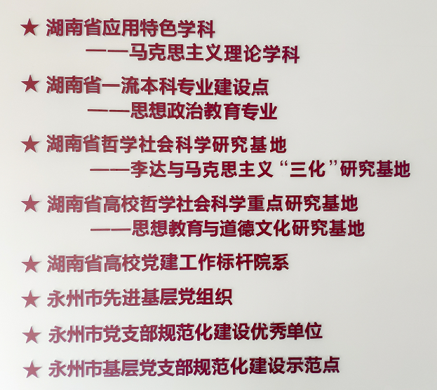 【平台建设】学院坚持以党建促发展,获评湖南省高校党建工作标杆院系。学院现有1个省级 “双一流”应用特色学科建设点——马克思主义理论学科;1个省级一流本科专业建设点——思想政治教育专业、2个省级哲学社会科学重点研究基地——“李达与马克思主义‘三化’研究”基地和“思想教育与道德文化研究”、1个省思想政治工作研究基地,2个校级研究所。