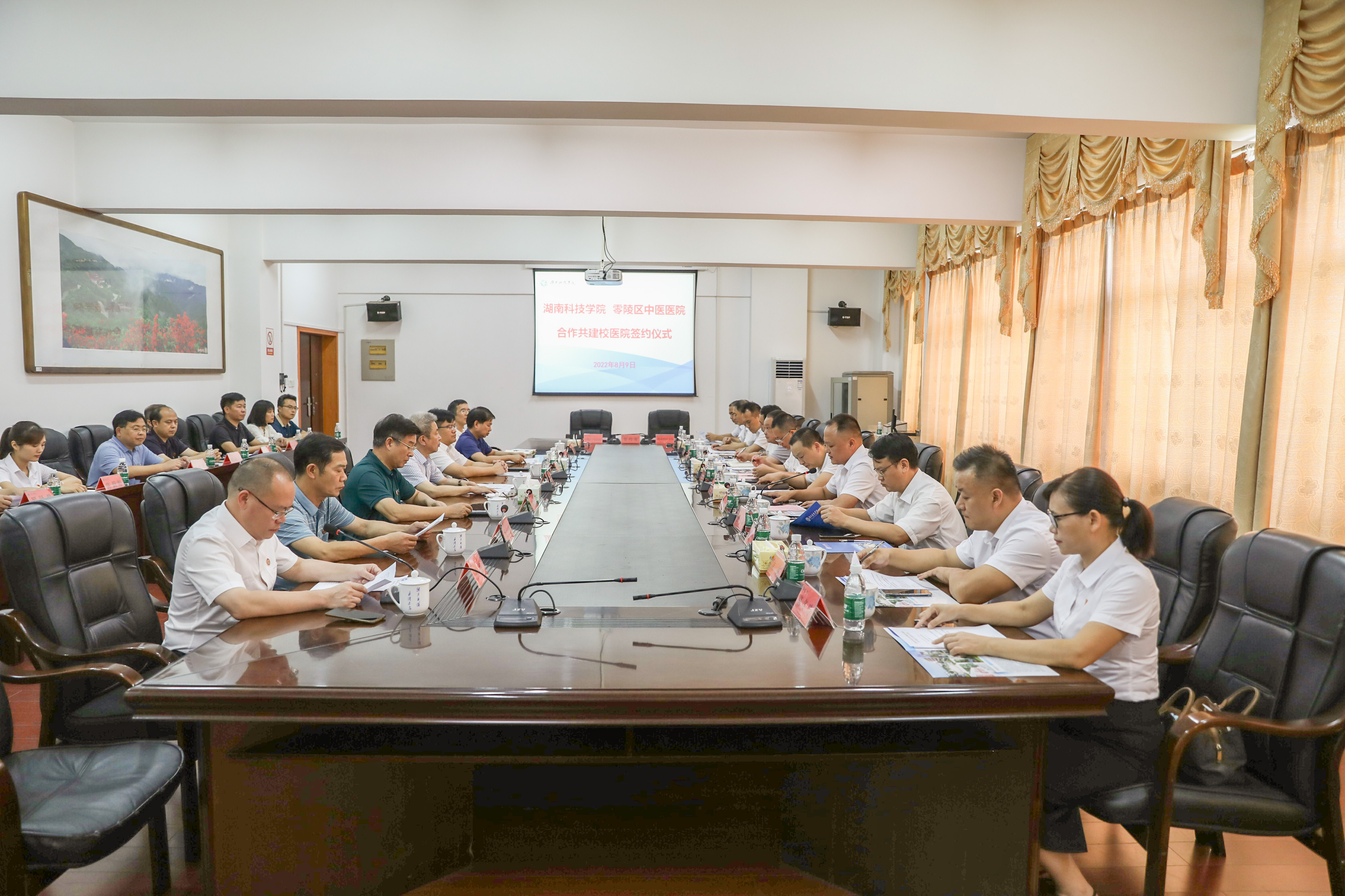 本网讯 8月9日,学校与零陵区中医医院合作共建校医院签约仪式顺利举行。校党委书记曾宝成,零陵区委副书记、区长龙亮、金沙集团1862cc、零陵区人民政府、区卫生健康局、区中医医院及相关单位部门负责人出席本次签约仪式。