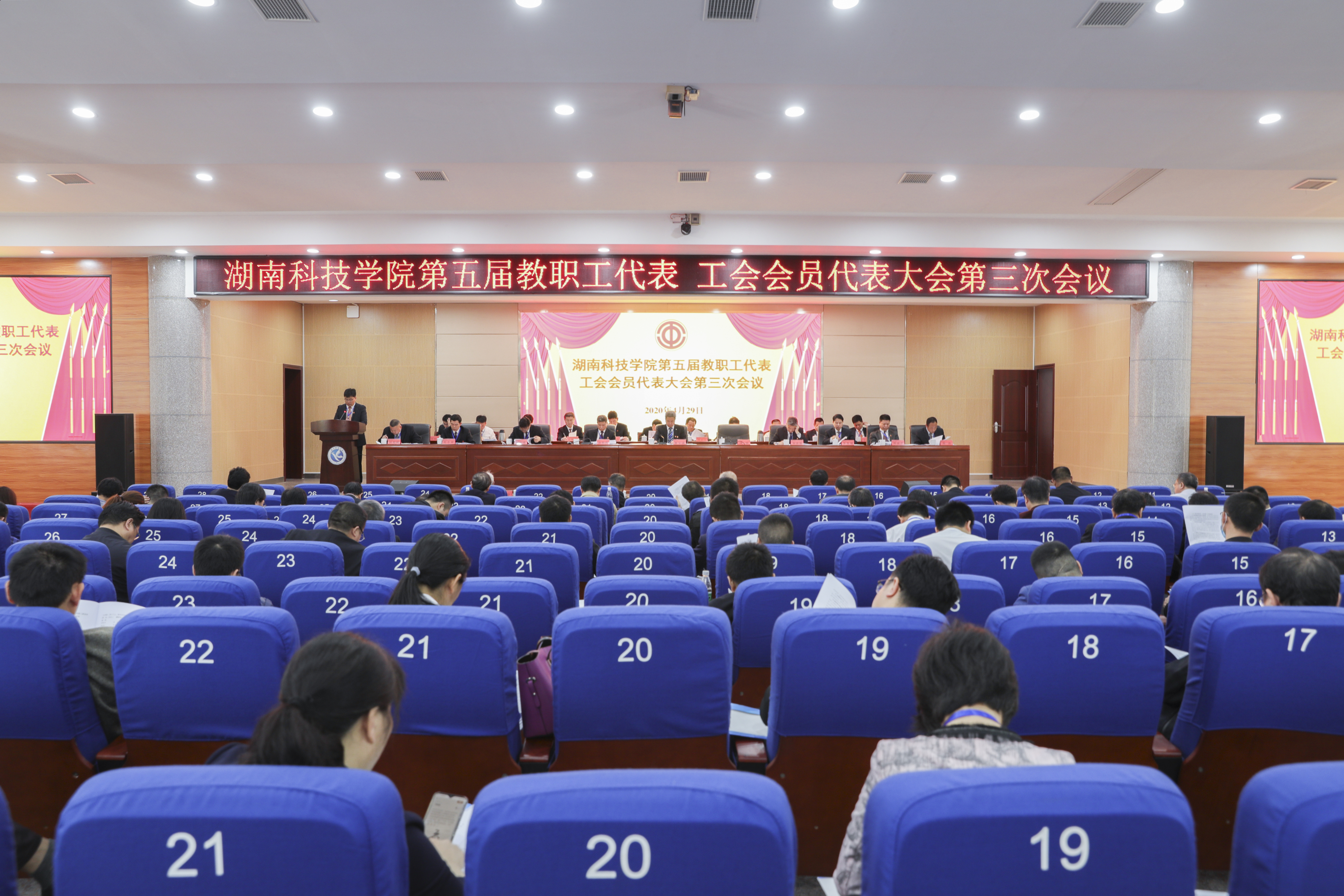 本网讯 春和景明,万象更新。4月29日上午,学校第五届教职工代表工会会员代表大会第三次会议在潇湘大讲堂开幕。大会主席团成员曾宝成、李钢、唐艳明、宋宏福、彭立威、李常健、吴小林、程智开、何福林、杨涛等 21人在主席台就坐。正式代表、特邀代表和列席代表200余人齐聚一堂,共商学校改革发展大计。