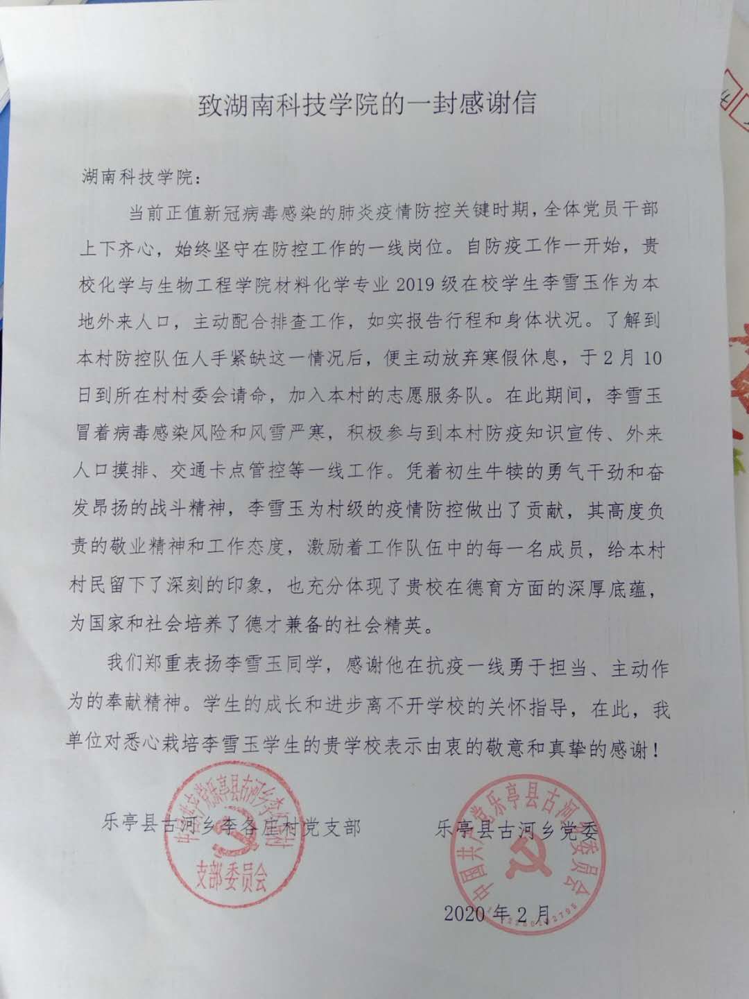 本网讯 日前,金沙集团收到唐山市乐亭县古河乡党委发来的一封感谢信,感谢金沙集团化学与生物工程学院材料化学专业2019级李雪玉同学,勇担使命、担当尽责,为家乡联防联控工作做出积极贡献,让青春在战“疫”中绽放。