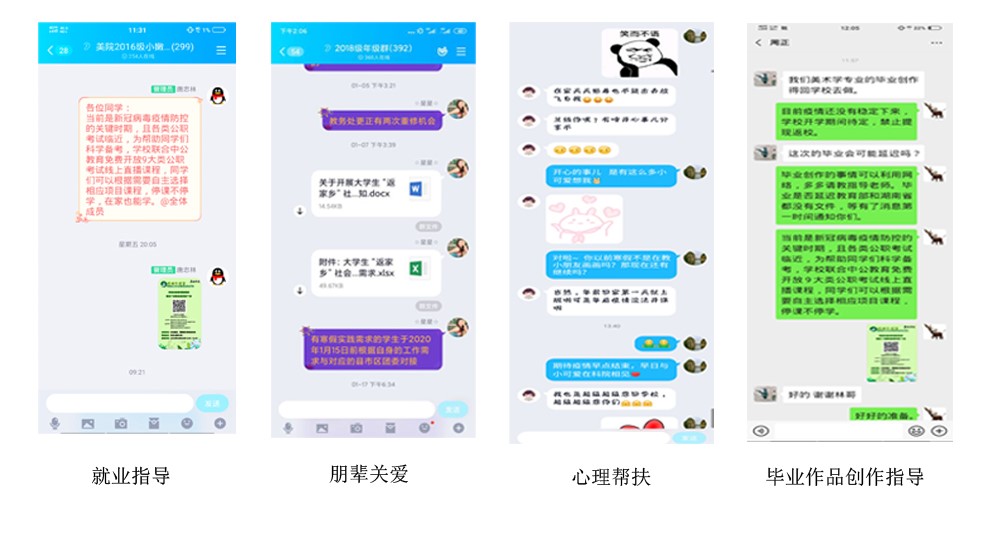 做好防控工作,思想稳定是关键。美术学院依托学院省级“党团先锋”服务平台,设立网络“党员服务岗”,实施朋辈“隐形关爱计划”,号召学生党员和团学干部积极主动担当,充分发挥学生党员和学生干部的朋辈育人作用。同时,打造“辅导员温馨两小时”特色心理辅导平台,组织辅导员在线与学生交流,及时对心理困难、经济困难、学习困难等在内的“七大类”困难学生进行辅导,坚持做到防疫期间心理帮扶“不下线”。此外,美术学院通过网络途径开展就业指导、求职实务、校友经验分享等活动,开展毕业生“一对一”网络就业咨询服务,积极筹备学院“2020届毕业生网络招聘会”,实现毕业生和用人单位网络交流对接。