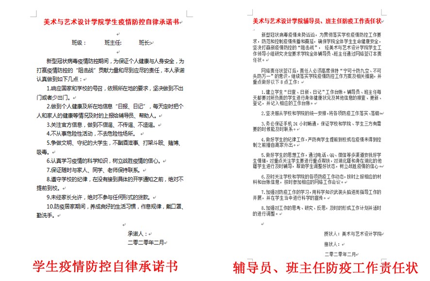 学生健康状况需要时刻关注。美术学院以最快的行动、最细的联络进行日排查、日登记;以最高的标准、最严的纪律进行全面布局;以最暖的措施、最好的帮扶进行多方面辅导。每天监测、统计了全院1200余名学生的有关情况,追踪排查了湖北籍以及他籍在湖北学生的去向情况,目前已组织对学生进行了32次全面排查,无确诊报告病例、无疑似病例。同时,组织辅导员和班主任线上签订了《防疫工作责任状》,全体学生线上签订了《疫情防控自律承诺书》,开展了“防控疫情,我们在一起”短心语、“战”疫宣传海报设计、分享身边的“防疫小故事”、学习打卡等一系列活动,通过实际行动凝聚广大学子之力,为打赢防控阻击战贡献力量。