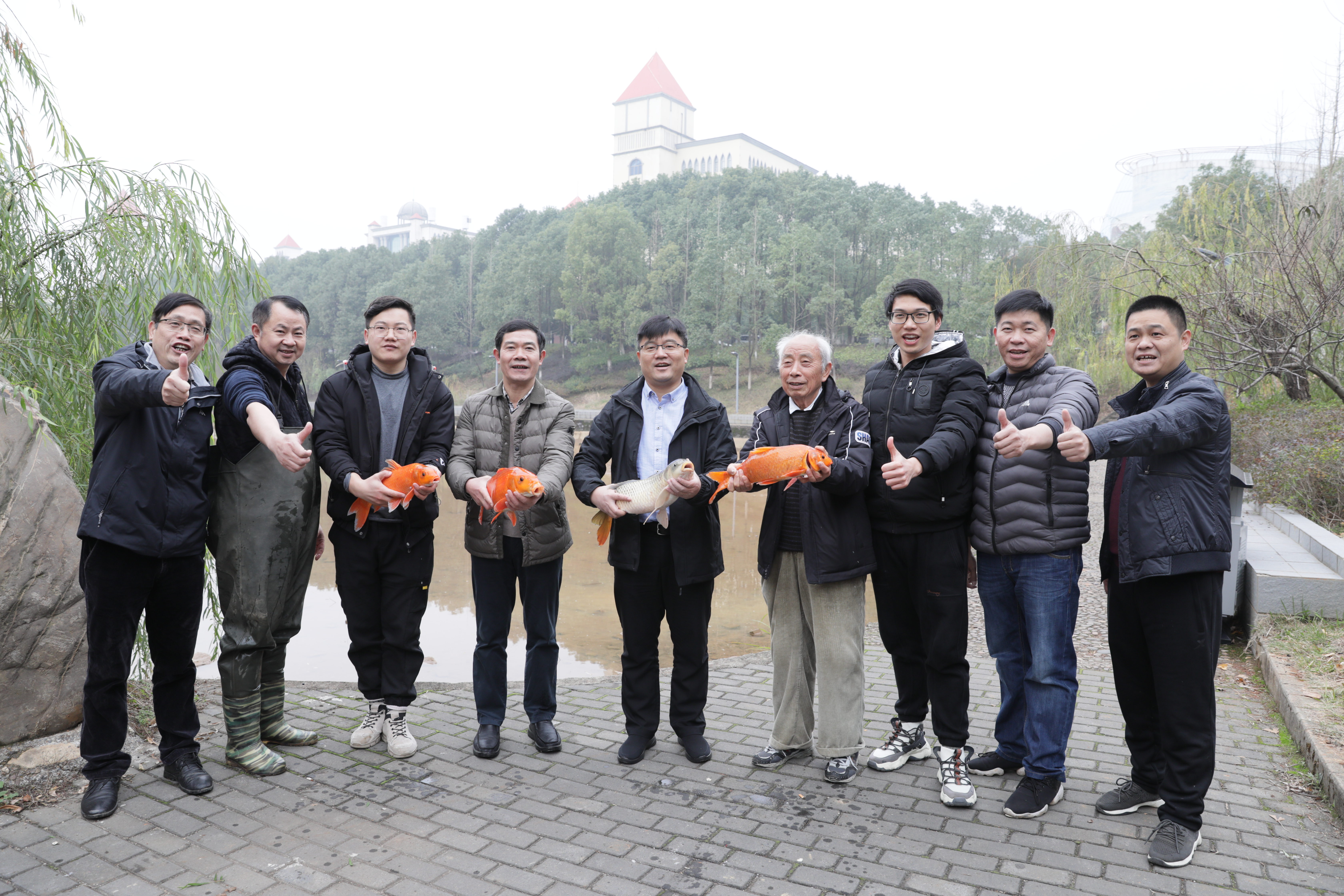 为了让师生们吃上新鲜美味的鲜鱼大餐,从12月29日开始,学校后勤服务总公司的师傅们便忙着张网捕捞校内人工湖里喂养的鲜鱼,这些鱼均为年初学校投放到人工湖,经过精心喂养,现在最大的鱼已重达到8斤,本次共捕捞鲤鱼、鲢鱼、鳊鱼、鲫鱼等鲜鱼1000余斤。校长李钢、副校长吴小林等来到捕鱼现场,邀请第五届中国“互联网+”大学生创新创业大赛金奖团队一起怀抱“锦鲤”合影送祝福。