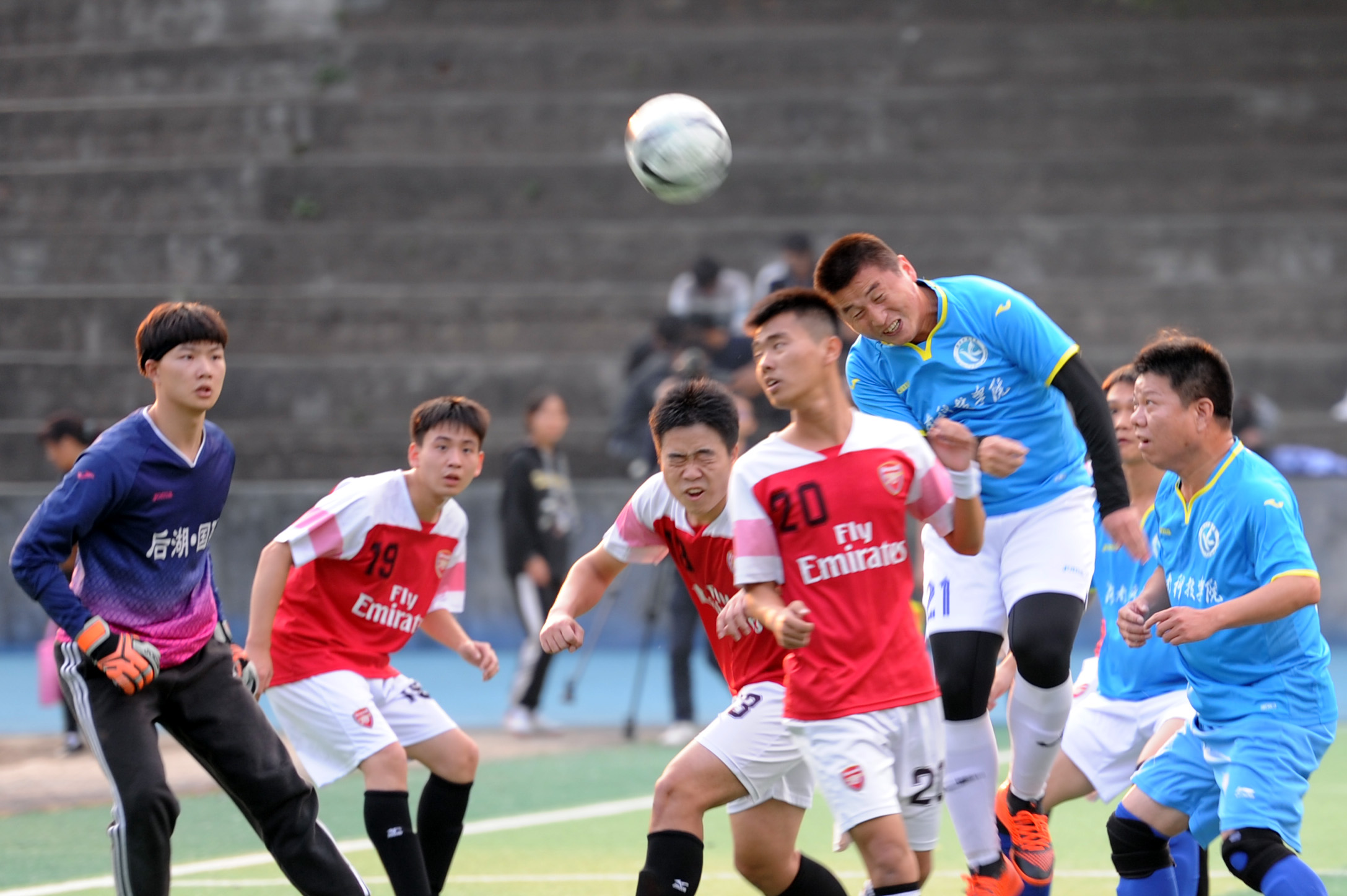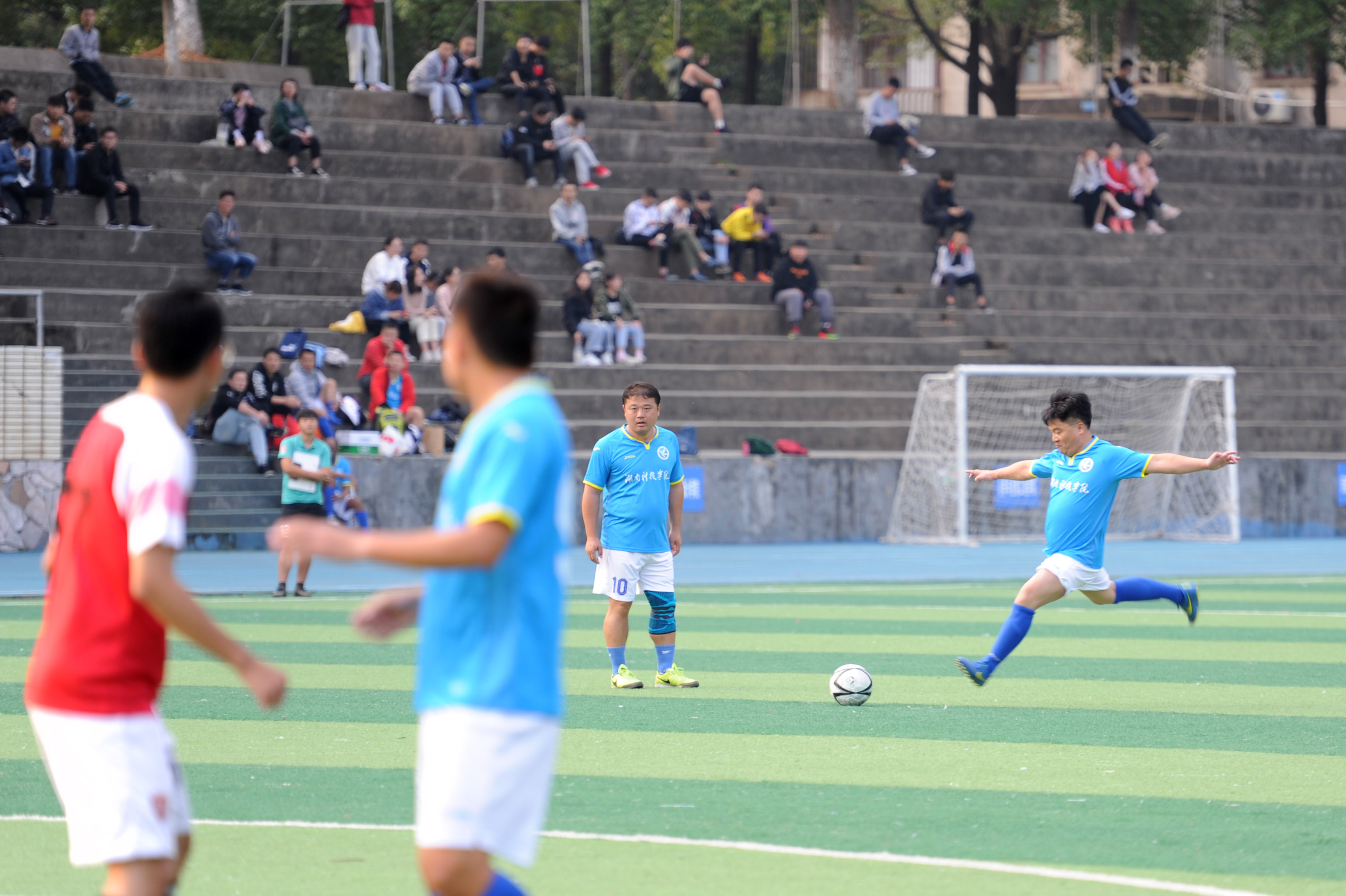 本网讯 传球、过人、射门……11月7日,一场精彩的师生足球赛在足球场上火热进行。对阵双方分别是校长李钢、副校长程智开带队的教工队与经管学院学生联队。这是校领导连续第五年带队参加师生足球友谊赛。
