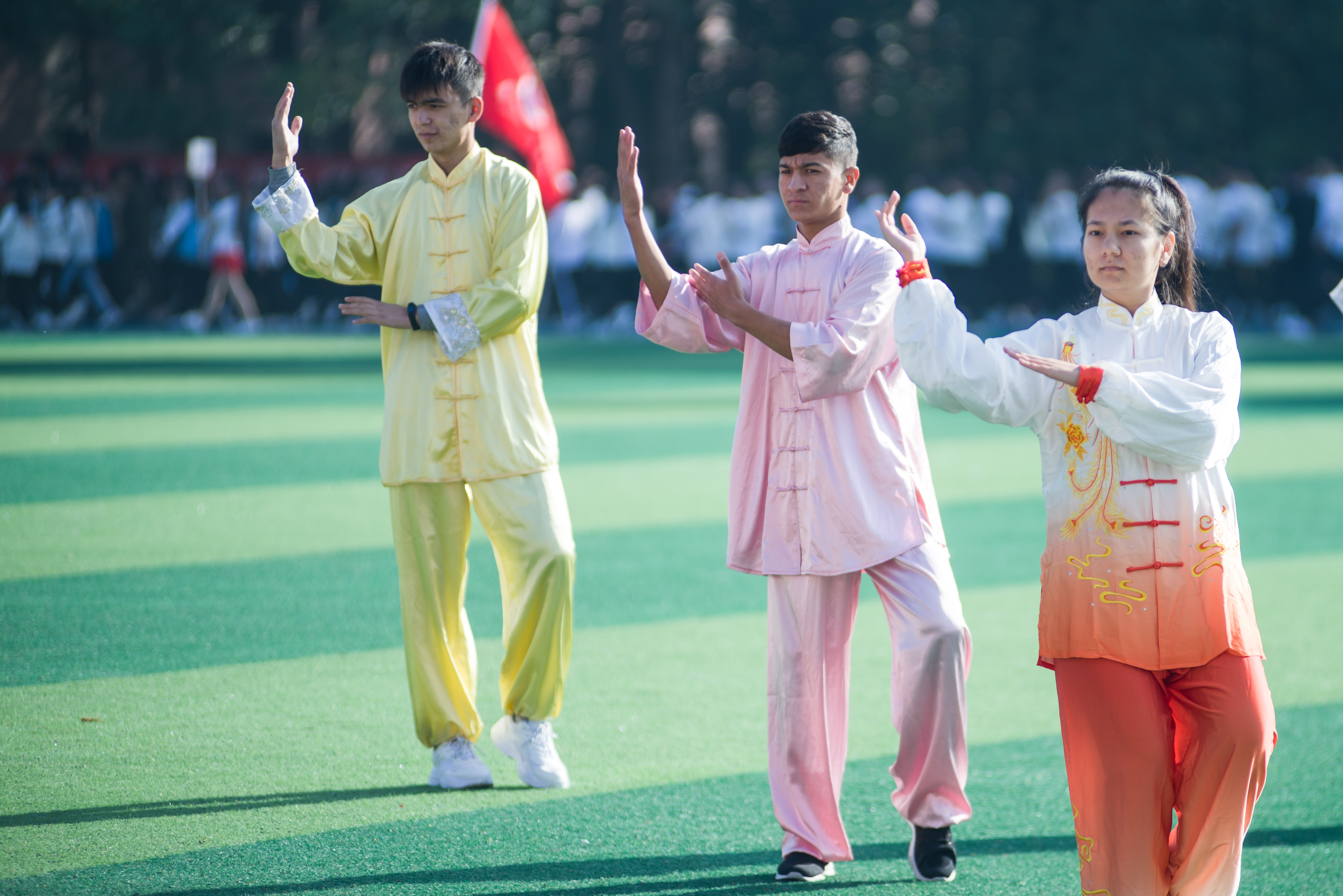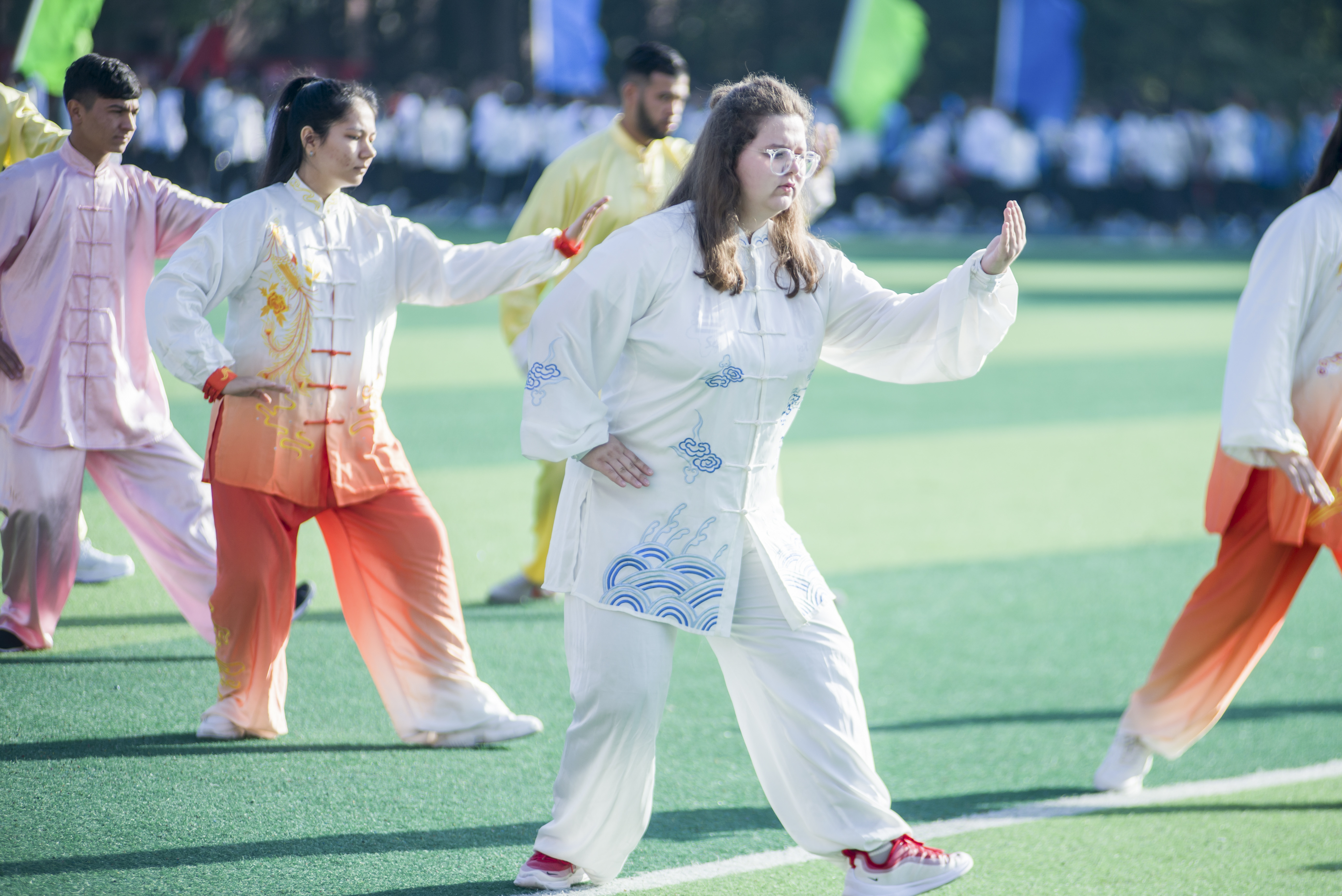 本网讯 10月31日,学校田径场,来自“一带一路”国家的留学生在表演太极。当天,学校第十四届田径运动会开幕,22名留学生身着太极服上场,舒展优雅的动作,整齐划一的太极神韵,赢得了全场观众的掌声。据了解,学校为留学生开有太极拳,五禽戏等体育课程,让留学生感受中国传统文化。