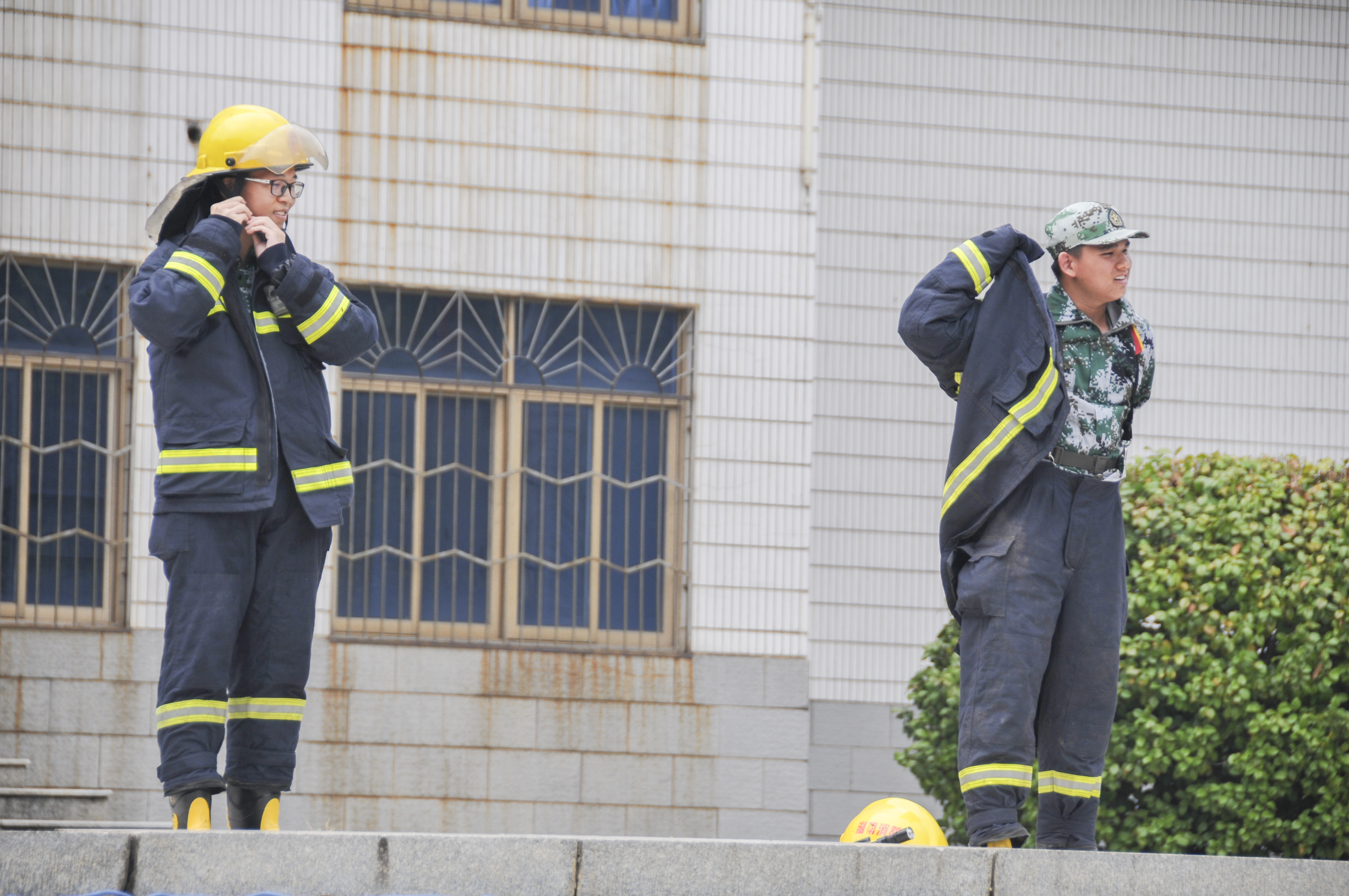 消防员还向军训新生展示了各类消防设备,介绍了其使用方法,并邀请5位新生代表体验如何快速穿上、脱下消防服。