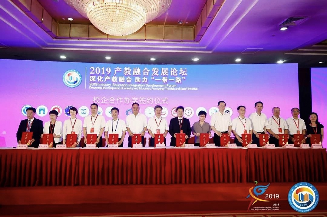 本网讯 7月19日,由中国高等教育学会指导,中国高等教育学会产教融合研究分会、中国教育电视台主办,中国教育报、中国民航报等协办,北京广慧金通教育科技有限公司承办的“深化产教融合 助力‘一带一路’”2019产教融合发展论坛在河北廊坊召开,来自教育界、国家民委、民航系统、全国400余所高校党委书记、校长等领导,海外40余位国家大学校长和驻华使节,以及200余家航空公司、机场集团、企事业单位领导和嘉宾共计700余人齐聚一堂,共商新时代产教融合发展。金沙集团副校长宋宏福带领教务处、传媒学院、旅游与文化产业学院等部门和学院负责人参加,并代表学校与北京广慧金通教育科技有限公司签订校企合作协议。