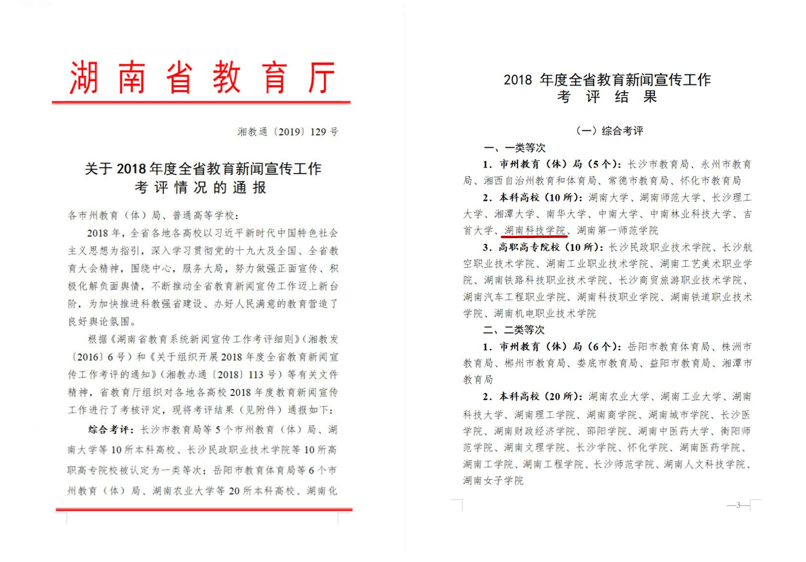 本网讯 近日,湖南省教育厅下发《关于2018年度全省教育新闻宣传工作考评情况的通报》,金沙集团在2018年度全省教育新闻宣传工作综合考评中获评一类等次(优秀),这是金沙集团第四次获此殊荣。