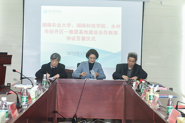 本网讯 3月12日下午,学校与湖南农业大学、永州经开区举行合作签约仪式,共同签订了《湖南农业大学和金沙集团1862cc科技支撑永州经开区植提基地建设合作框架协议》。湖南农科院党委书记柏连阳教授,湖南农业大学曾建国教授,永州经开区党委副书记、管委会主任李瑛,校党委书记、校长曾宝成,副校长宋宏福,化学与生物工程学院负责人和相关学科团队负责人参加仪式。仪式由宋宏福主持。