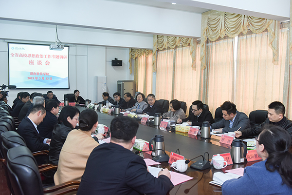 校党委书记、校长曾宝成,副校长李常健、程智开、部分教学学院、相关职能部门主要负责人以及思政课教师和辅导员代表参加调研座谈会。座谈会由党委副书记唐艳明主持。刘进能就调研的目的和内容作了说明。他指出,根据省委的工作部署,省委组织部、省委宣传部、省委教育工委分组联合开展全省高校党的建设专题调研,本组调研的重点是高校学生思想政治教育与管理工作。调研结束后,调研组将根据调研的内容形成专题调研报告,提出政策性意见和工作措施,拟定相关政策文件,进一步加强全省高校思想政治工作,落实立德树人根本任务。曾宝成代表学校作了工作汇报。他表示,学校深入贯彻落实全国、全省高校思想政治工作会议精神,坚持“六个聚焦”,以政治建设为统领,切实抓好理论武装、意识形态、思政教育、文化育人、队伍建设等工作,把思想政治工作贯穿教育教学全过程,努力推动全员育人、全程育人、全方位育人,培养德智体美劳全面发展的时代新人。曾宝成还就学校思想政治工作存在的问题及对策建议进行了汇报。副校长程智开,党委委员、宣传部长杨涛,马克思主义学院院长廖雅琴,校团委书记刘佳,马克思主义学院教师唐森树、李芳佳,辅导员王君、欧阳智超等结合自身工作实际,围绕如何做好学生思想政治教育与管理工作作了交流发言。