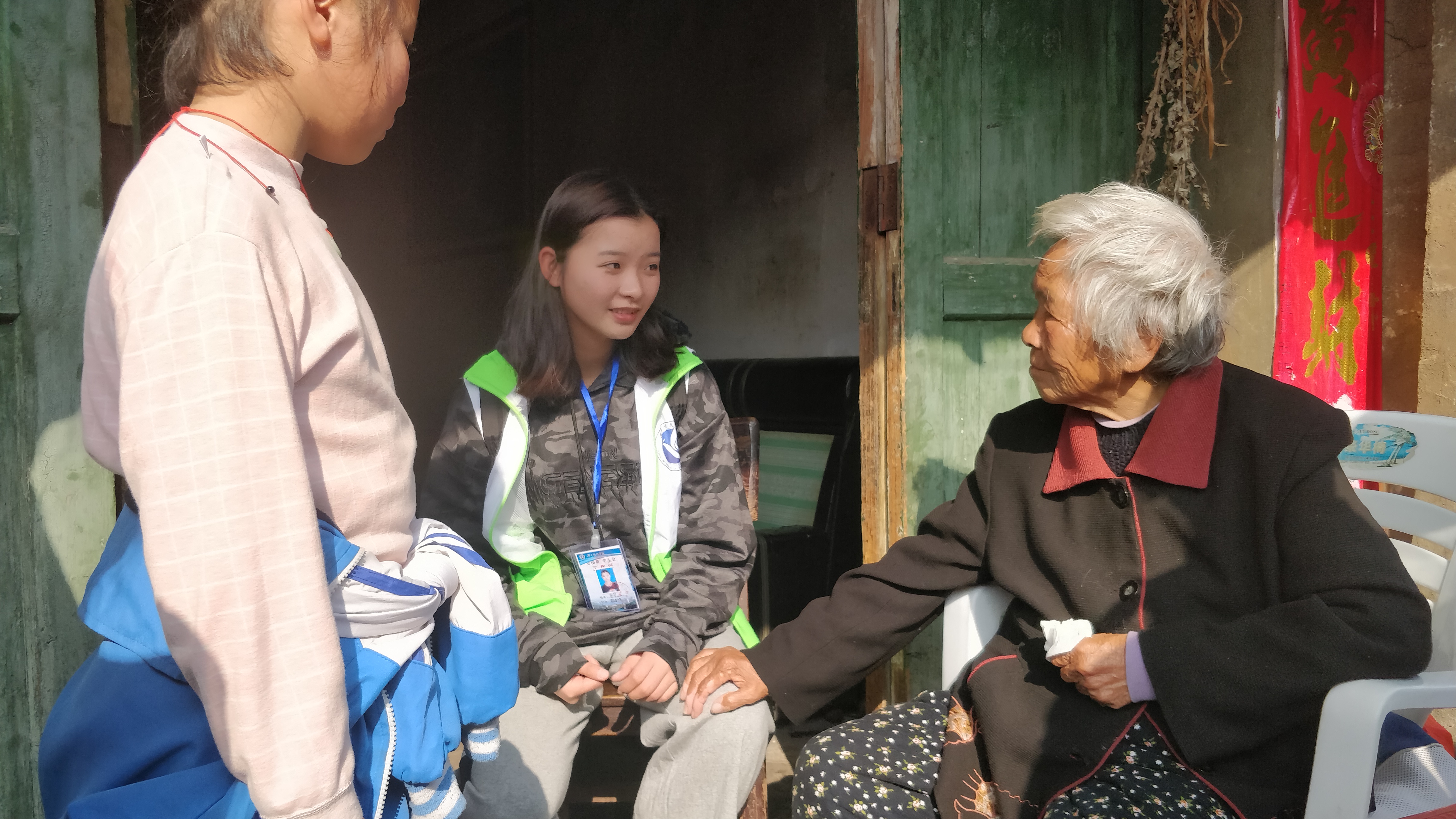 老人们上了年纪,听力不太好,志愿者们和他们聊天往往得提高音量,凑到耳根说话。“爷爷,您现在身体如何?”“奶奶,您有几个子女?您目前还有急需要解决的困难吗?……”从家庭生活、身体状况到邻里关系,志愿者们尽可能地了解老人们的基本情况,根据不同情况调整帮扶方案。老人们也爱敞开心扉地与志愿者们畅聊,尤其说到自己的青春岁月时,老人们滔滔不绝:“我年轻的时候家里所有的农活都是我包干,那时我身体好的很,从来没有生过病……”说到激动处老人像小孩子一样比划着,高涨的情绪让志愿者们也跟着开怀大笑起来。