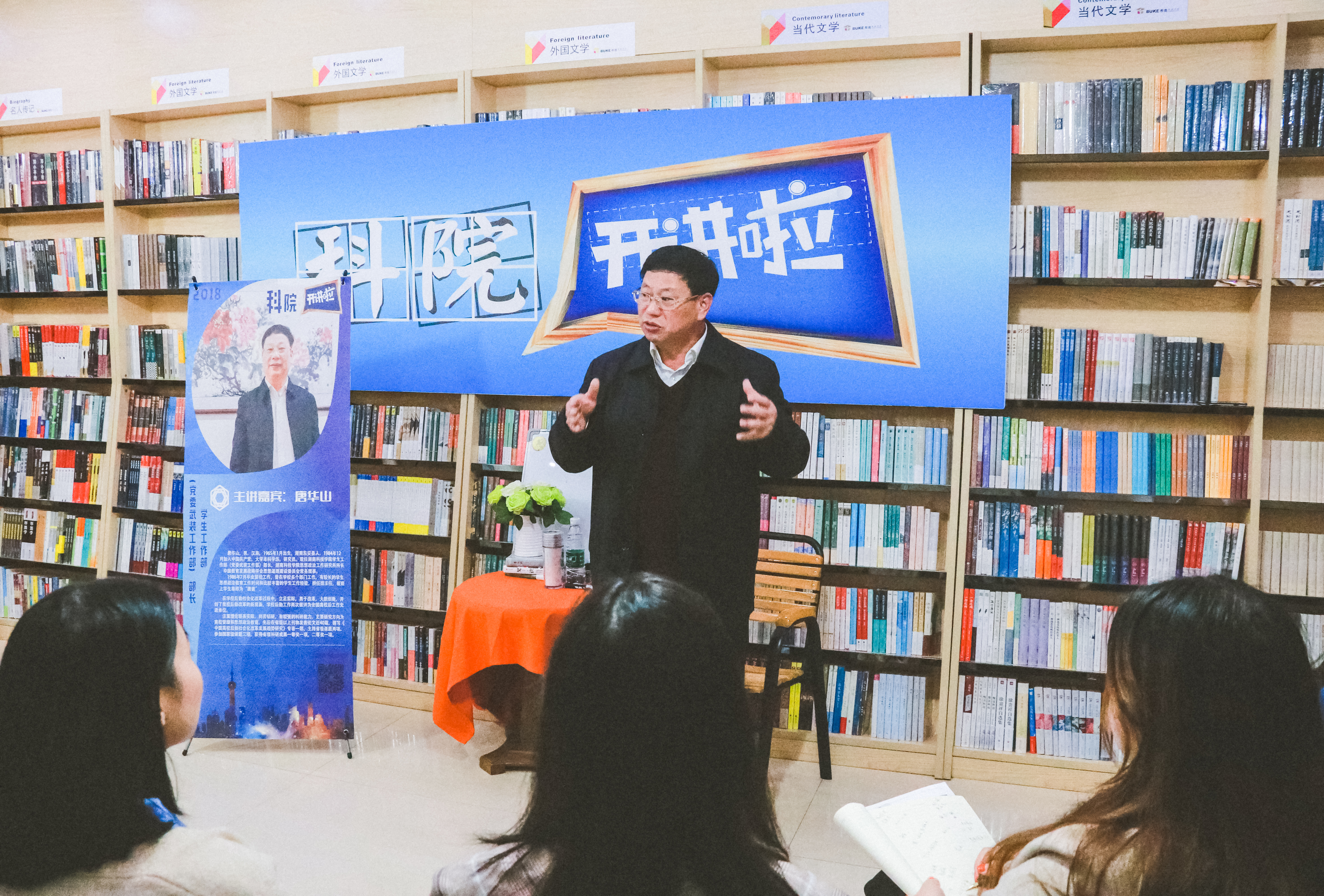 本网讯 11月16日晚,学校第十二期“科院开讲啦”在布克校园书店举行,校学生工作部(党委武装工作部)部长唐华山研究员受邀开讲。