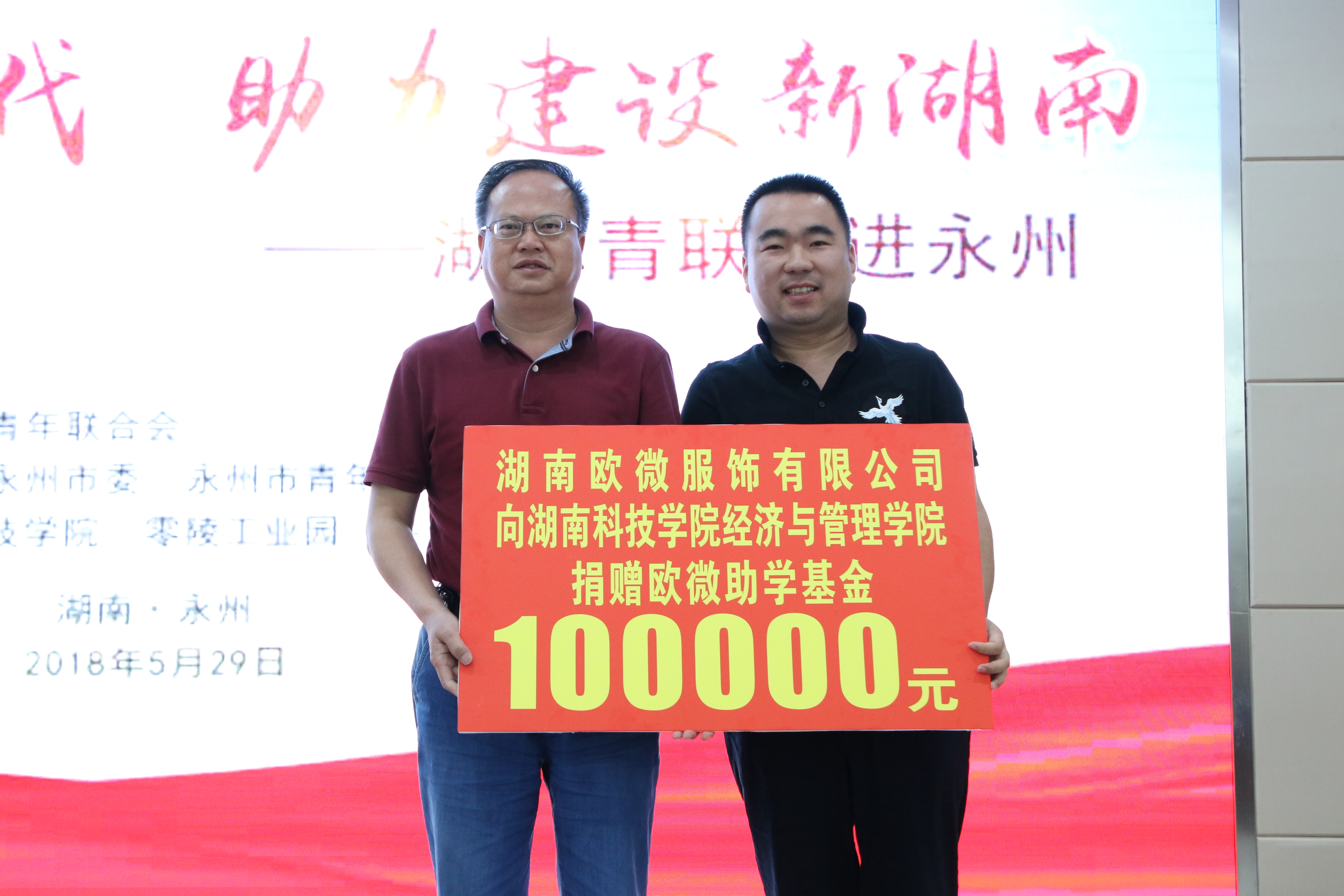 宣讲结束后,李玉龙向金沙集团经济与管理学院“欧微助学基金”捐款10万元,用于资助该院贫困学子。