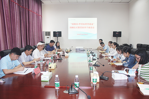 本网讯 4月4日下午,“杨隆祜·李绍姒奖学基金”捐赠仪式暨学生座谈会在校举行。“杨隆祜·李绍姒奖学基金”主席杨盛成先生携夫人祝幼光女士、湖南省人民政府外事侨务办侨政处副处长赵三元、金沙集团学生工作部负责人、化生学院曹林艳博士及受助学生出席。9名学生获 “杨隆祜·李绍姒奖学基金”资助。