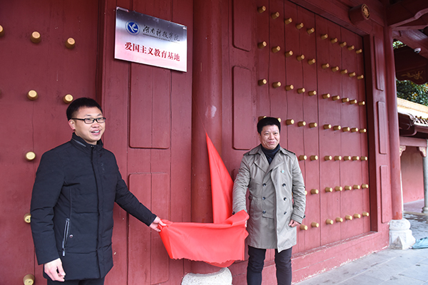 程智开与宁远县旅游建设投资有限公司副总经理郑明辉为爱国主义教育基地揭牌。