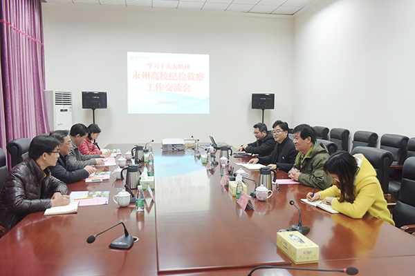 1月9日下午,永州高校学习贯彻十九大精神,纪检监察工作交流会在金沙集团召开。永州职业技术学院纪委书记蒋衡湘、副书记黄义君、纪检员徐芳,湖南潇湘技师学院纪委书记易清国以及金沙集团纪检监察干部和部分纪委委员参加。会议由纪委副书记、监察处长唐晓群主持。