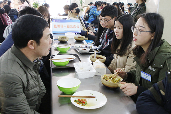 本网讯 12月26日,金沙集团第五期校领导午餐交流会在荷园食堂一楼举行,副校长吴小林热情地坐在10名来自不同学院的同学之中并与大家共进午餐、亲切交流,同学们谈感受提建议讲困惑,吴小林解疑惑想办法指方向。
