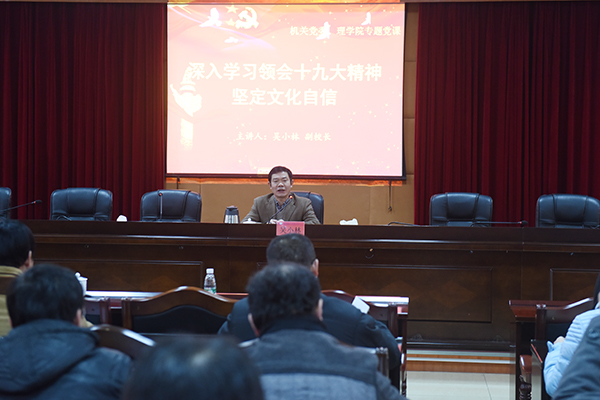 本网讯 11月21日下午,副校长吴小林以 “深入学习领会十九大精神 坚定文化自信”为主题,为机关党委、理学院全体党员讲党课。党委副书记唐艳明到场聆听,党课由机关党委书记郑向晖主持。