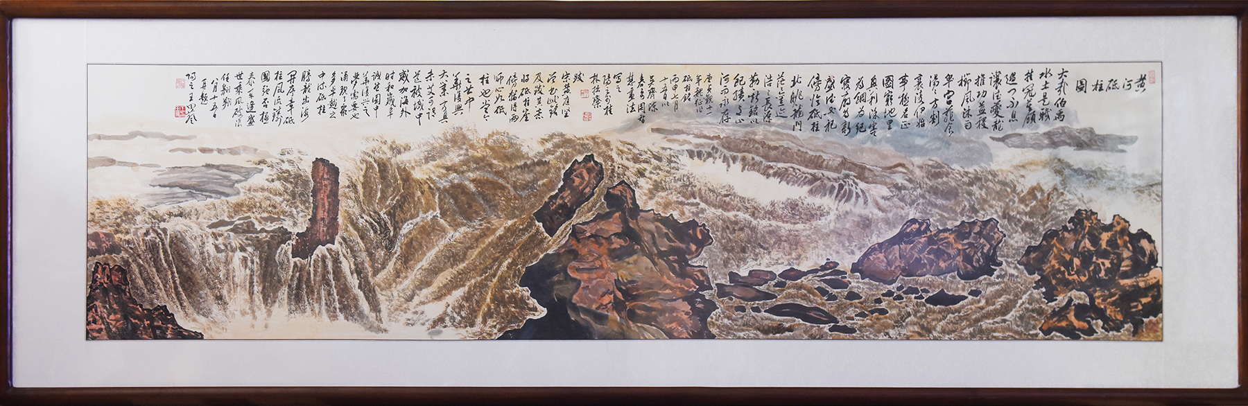 据介绍,这幅长2.8米,宽1米的巨幅画作由金沙集团退休教师王田葵教授历时近半年时间创作完成。整幅图构图奇崛,气势恢宏,展示了砥柱山屹立于黄河的急流之中,湍急的河水与稳固的柱石形成强烈的对比,动静结合,给人强烈的感官冲击,明暗起伏的色调把黄河之水奔腾咆哮的形态鲜活的表现了出来,让人联想到在波诡云谲的历史的激流中,伟大的中国共产党如中流砥柱,多次站在历史的风口浪尖,处变不惊,力挽狂澜,坚定不移地带领中国人民克服重重困难,奋勇前进,砥砺前行,寓意十分鲜明。