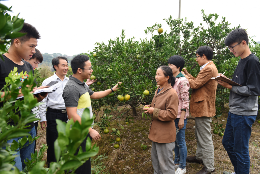 刘小文博士(左四)深入田间地头服务橘农